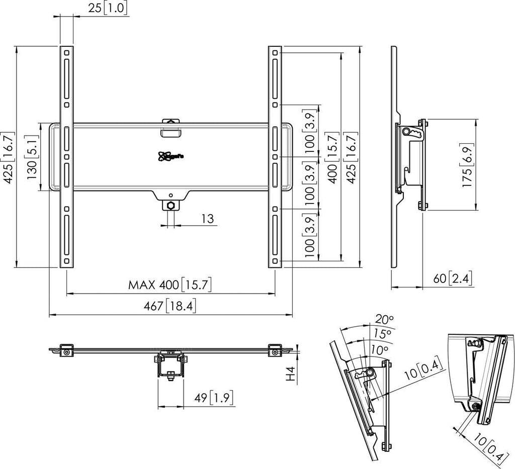 La interfaz es adecuada para pantallas pequeñas y medianas con un VESA de hasta 400x400 mm y un peso máximo de 25 kg. Esta interfaz dispone de una función de nivelación e inclinación (en incrementos de 0-10-15-20°). Si desea una solución de techo completa, combine esta interfaz de pantalla con un tubo PUC24xx y una de las placas de techo Connect-it adecuadasas para este fin.