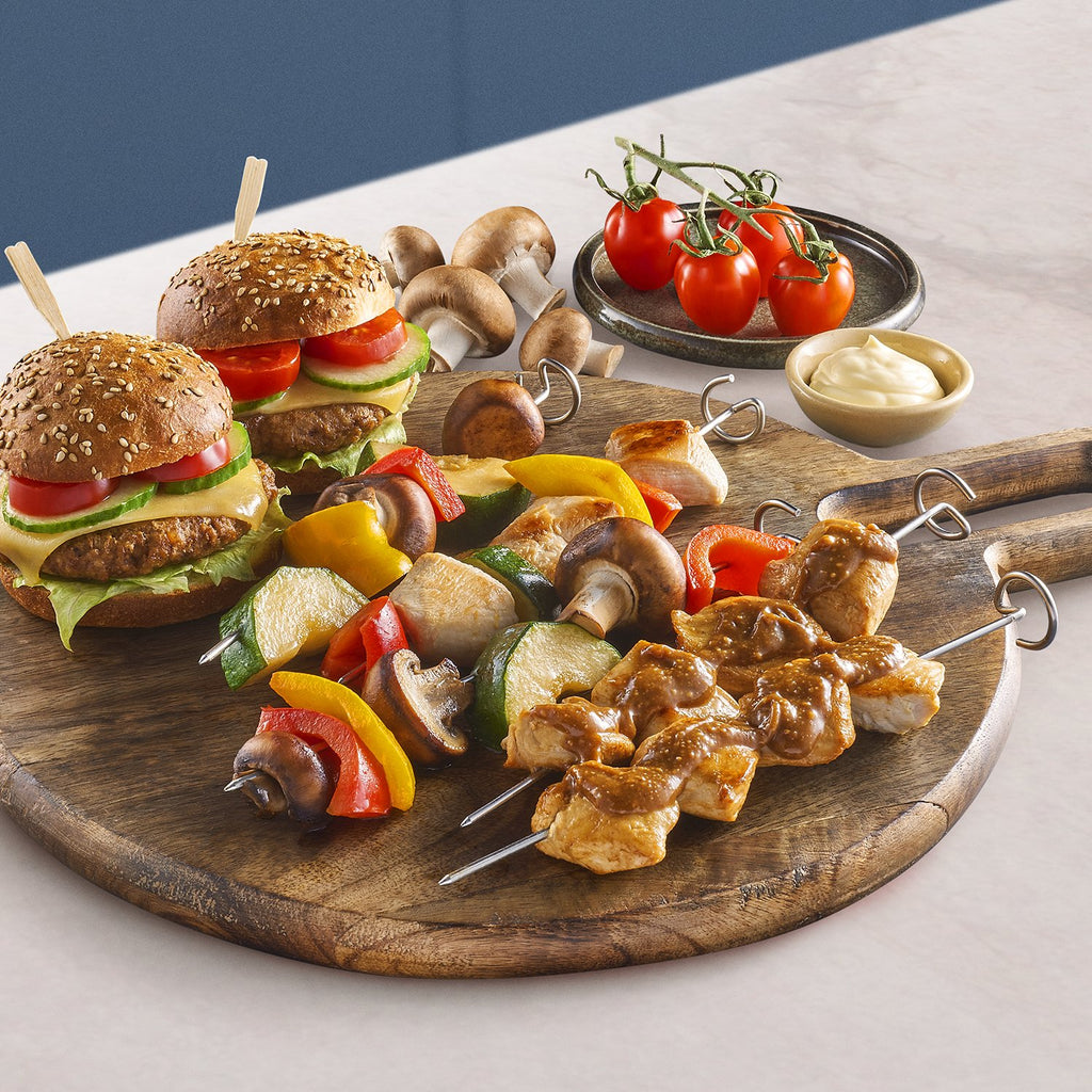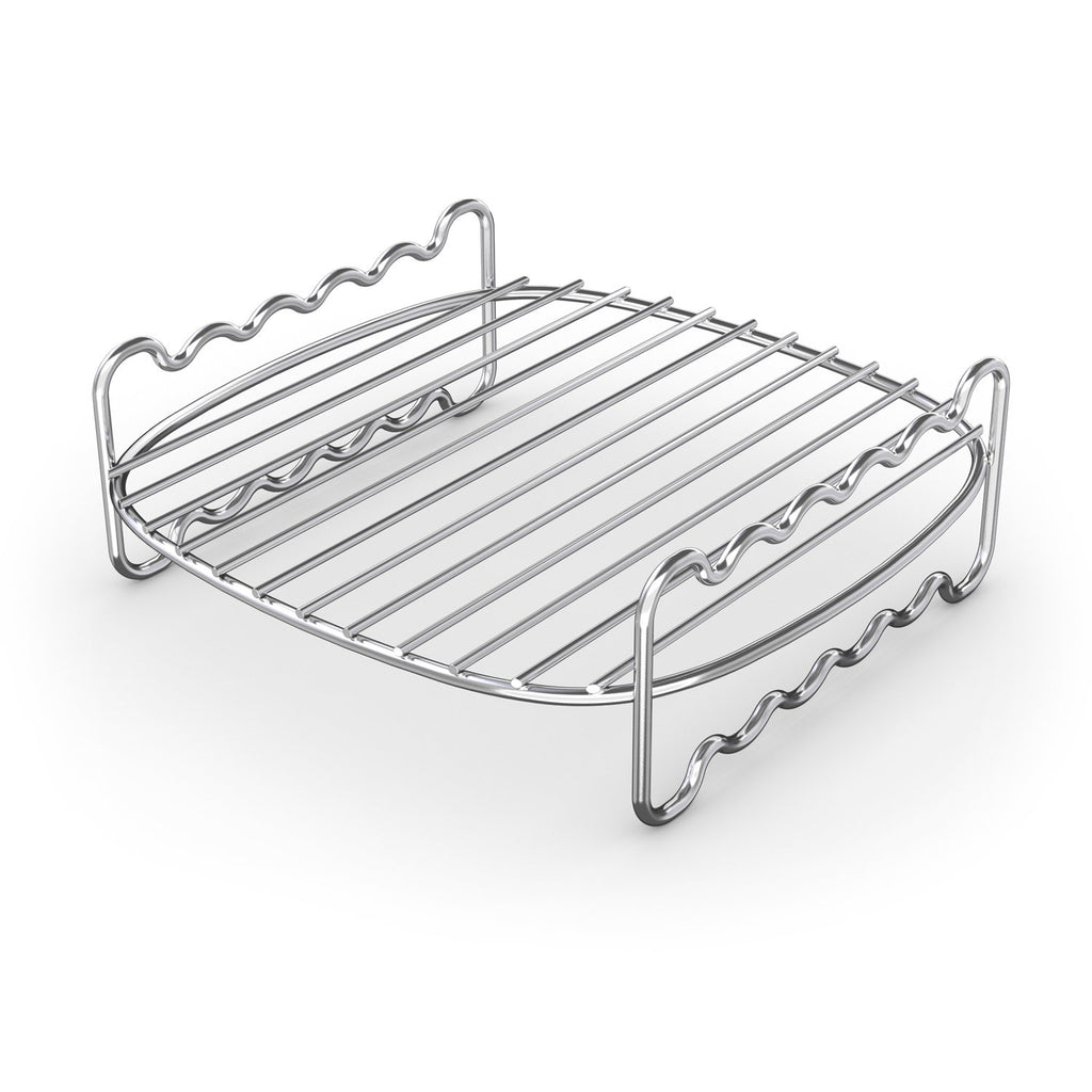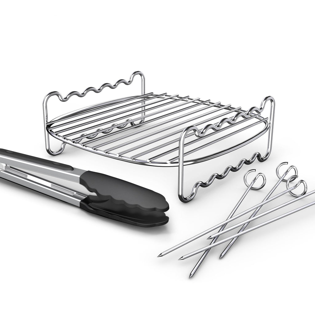 Amplía la superficie de cocción de la Airfryer con el set de doble capa. Asa o fríe deliciosas hamburguesas, alitas de pollo, pescado y mucho más de forma fácil, rápida y saludable. Para mayor versatilidad, usa los pinchos para preparar brochetas de verduras o carne.