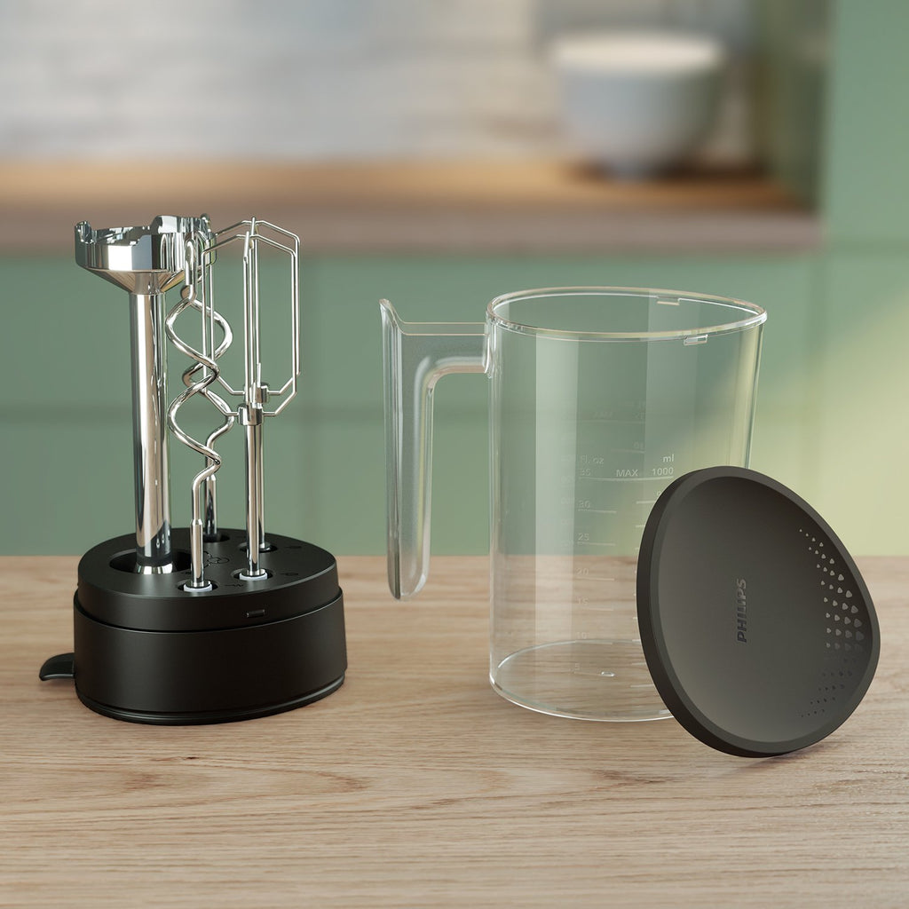 Ahorra espacio y mantén la cocina ordenada guardando los accesorios en el inteligente vaso de preparación y almacenamiento todo en uno de 1 l.