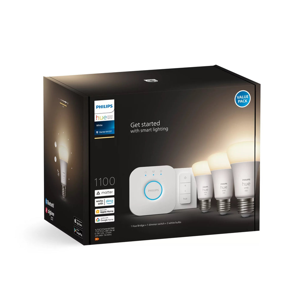 Philips Hue White Kit de inicio: 3 bombillas inteligentes E27 (1100) + regulador de intensidad, Bombilla inteligente, Bluetooth, Blanco, LED integrado, E27, A60