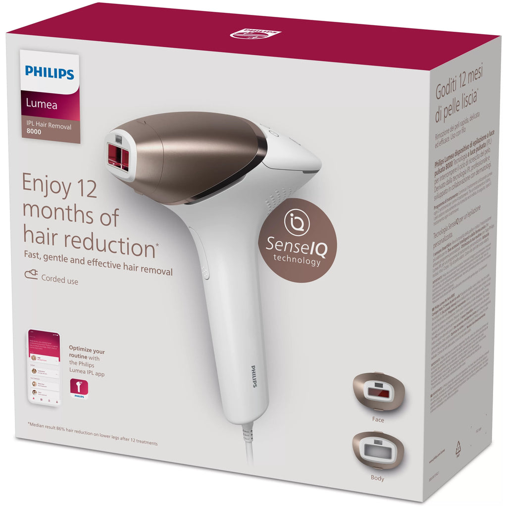 Disfruta de un tratamiento rápido y personalizado con Lumea IPL Serie 8000 Prestige. Tecnología SenseIQ con accesorios inteligentes y aplicación Lumea IPL para conseguir una piel suave durante más tiempo.