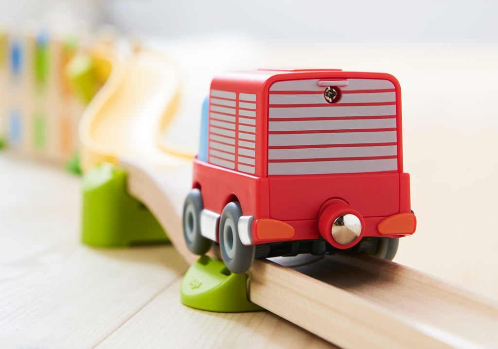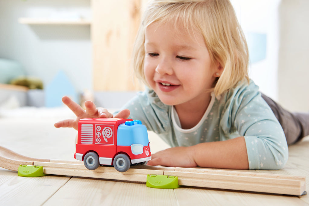 El potente accionamiento a pilas permite que el coche de bomberos se desplace de aquí para allá por todas las pistas. Y cuando el accionamiento se apaga, el coche puede moverse también de forma manual.
