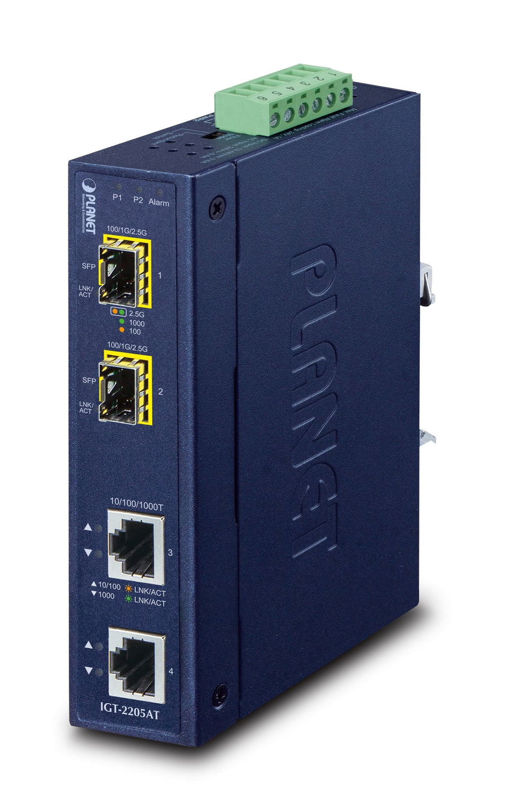 PLANET IP30 Industrial 2-port, IEEE 802.1p, IEEE 802.3, IEEE 802.3ab, IEEE 802.3u, IEEE 802.3x, IEEE 802.3z, Azul, Metal, IP30, SFP, 32 mm