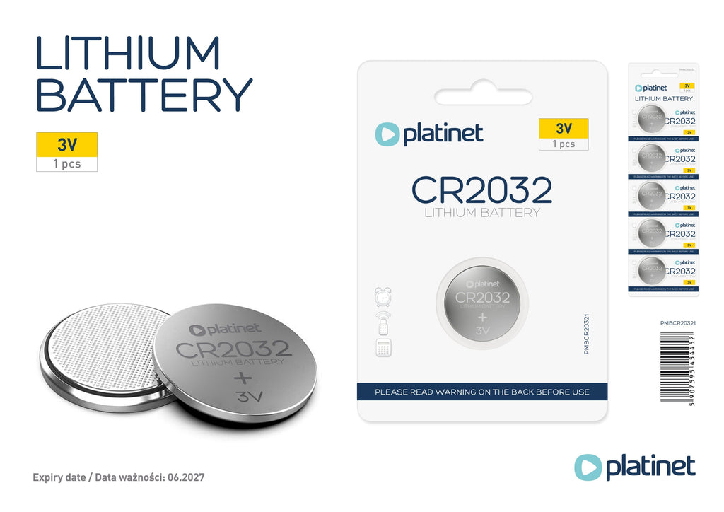 Platinet PMBCR2032, Batería de un solo uso, CR2032, Litio, 3 V, 5 pieza(s), 3 año(s)