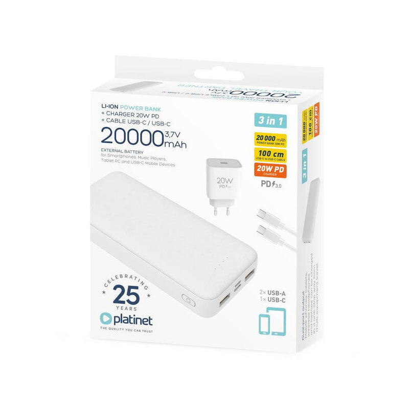 Platinet Power Bank 20000mah + 20w Pd Cargador + Cable 1m Blanco