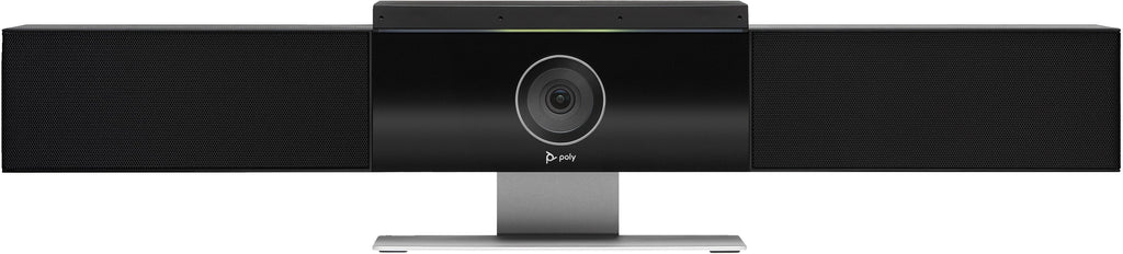 - Los potentes altavoces estéreo garantizan que todos los usuarios puedan escuchar. Un conjunto de seis micrófonos te ofrece la seguridad de que cada idea se transmite de forma clara. Con Poly, todos participan de igual manera en las reuniones.