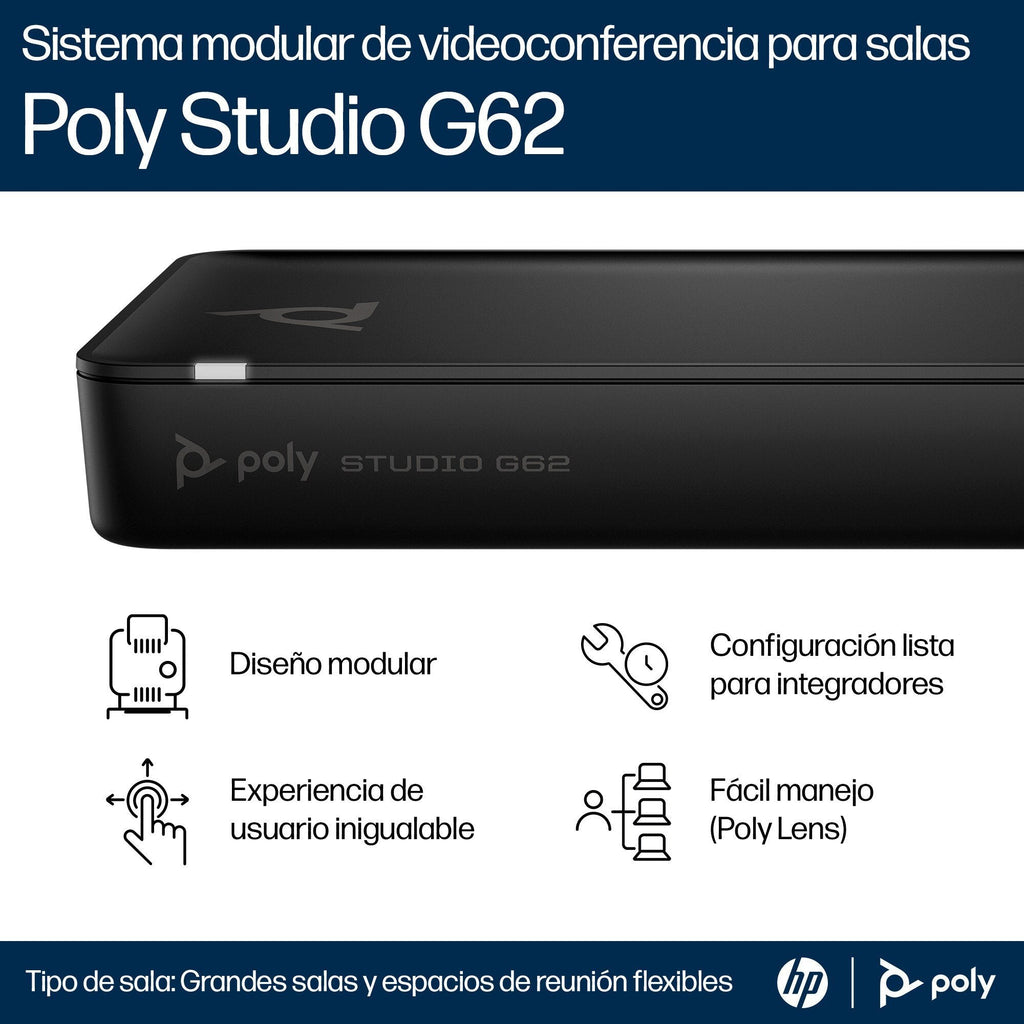 - Crea el equipo perfecto para salas de reuniones con el sistema de videoconferencia Poly Studio G62. Amplía tu configuración en función de tus necesidades sin tener que preocuparte de la capacidad de procesamiento, ya que podrás añadir más dispositivos audiovisuales para lograr una experiencia más versátil e interactiva[1].