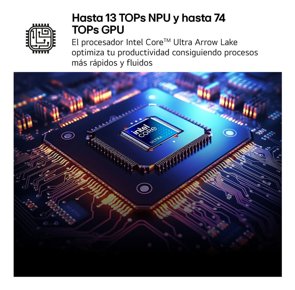 El último procesador Intel Arrow Lake H, que incluye una Unidad de Procesamiento Neural (NPU) capaz de manejar hasta 13 teraoperaciones por segundo (TOPS) para tareas de AI, ahora está integrado en el LG gram, ofreciendo un rendimiento potente optimizado para portátiles. Con una eficiencia energética innovadora y el rendimiento distintivo de un procesador dedicado a la AI, maneja de manera eficiente las tareas de AI y aprendizaje automático