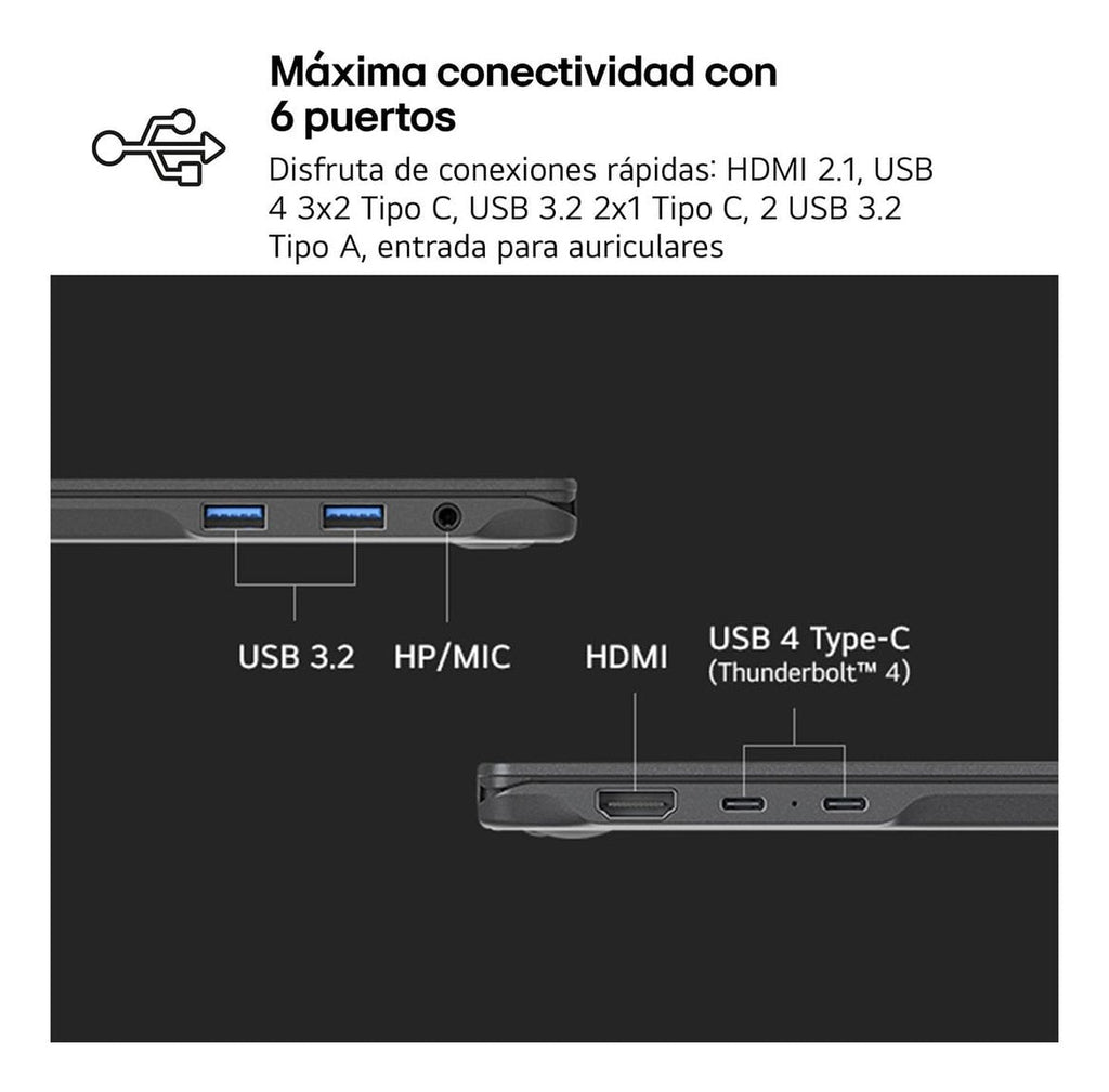 - Conectividad rápida y eficiente con 6 puertos: 2 USB 3.2, 2 USB Tipo C con Thunderbolt 4 para carga ultrarrápida, HDMI 2.1 y entrada para auriculares