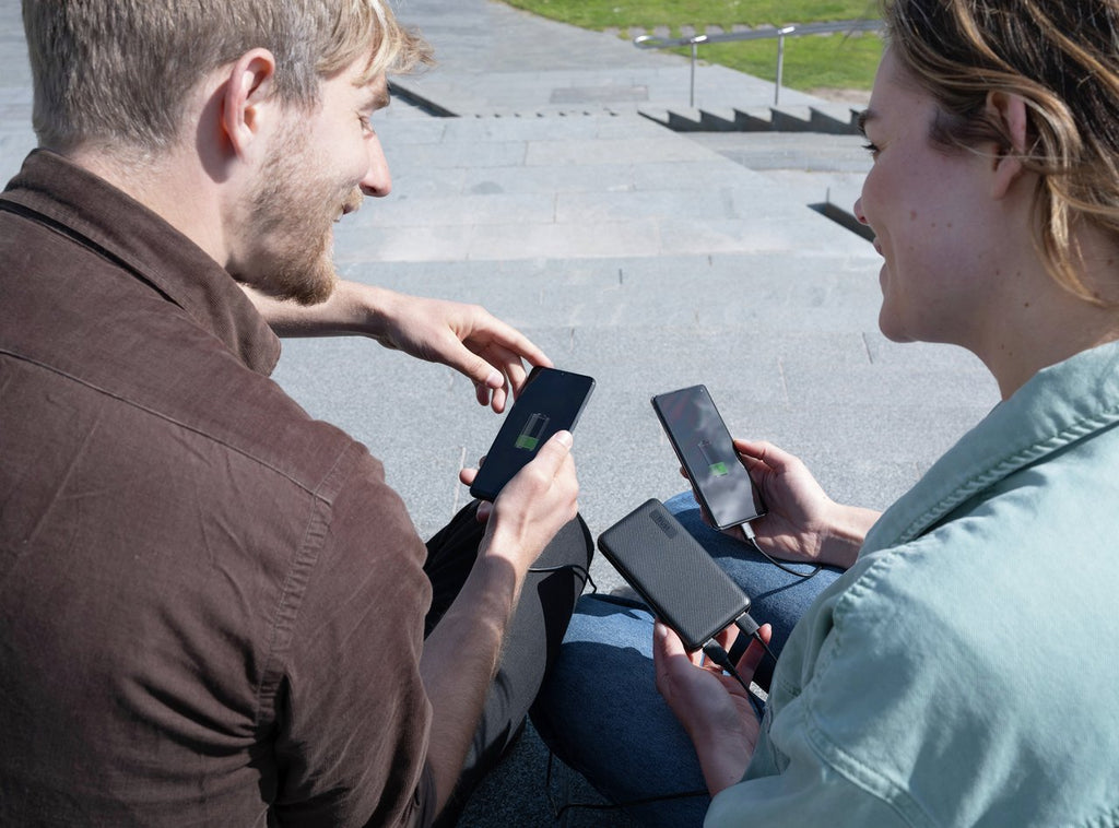 Carga simultáneamente tres teléfonos o tabletas de cualquier marca a través de 1 puerto USB-A y de 1 puerto USB-C, para que siempre estés conectado y preparado para trabajar (o jugar). Recarga la propia batería externa móvil por el cable micro-USB incluido o el puerto USB-C.