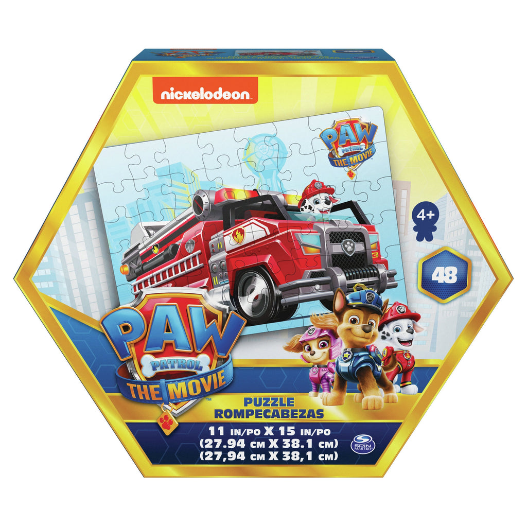 Revive tus momentos favoritos de PAW Patrol: The Movie con un colorido rompecabezas de 48 piezas. Una forma genial de juntar a la familia o a los amigos. Cada uno de los rompecabezas de cartón se compone de piezas completamente encajables y muestra una escena llena de acción inspirada en los rescates de los cachorros en Ciudad Aventura. Mira cómo los cachorros cobran vida en sus elegantes vehículos mientras buscas y encuentras las piezas adecuadas. Con 48 piezas grandes diseñadas para manos pequeñas, cada rompecabezas mide 27,94 cm x 38,1 cm una vez terminado. Las piezas vienen en una caja única con forma de hexágono que completa un regalo inolvidable para cumpleaños y fiestas. Móntalo una y otra vez: con un rompecabezas de la Patrulla canina, ninguna ciudad es demasiado grande ni ningún cachorro es demasiado pequeño.