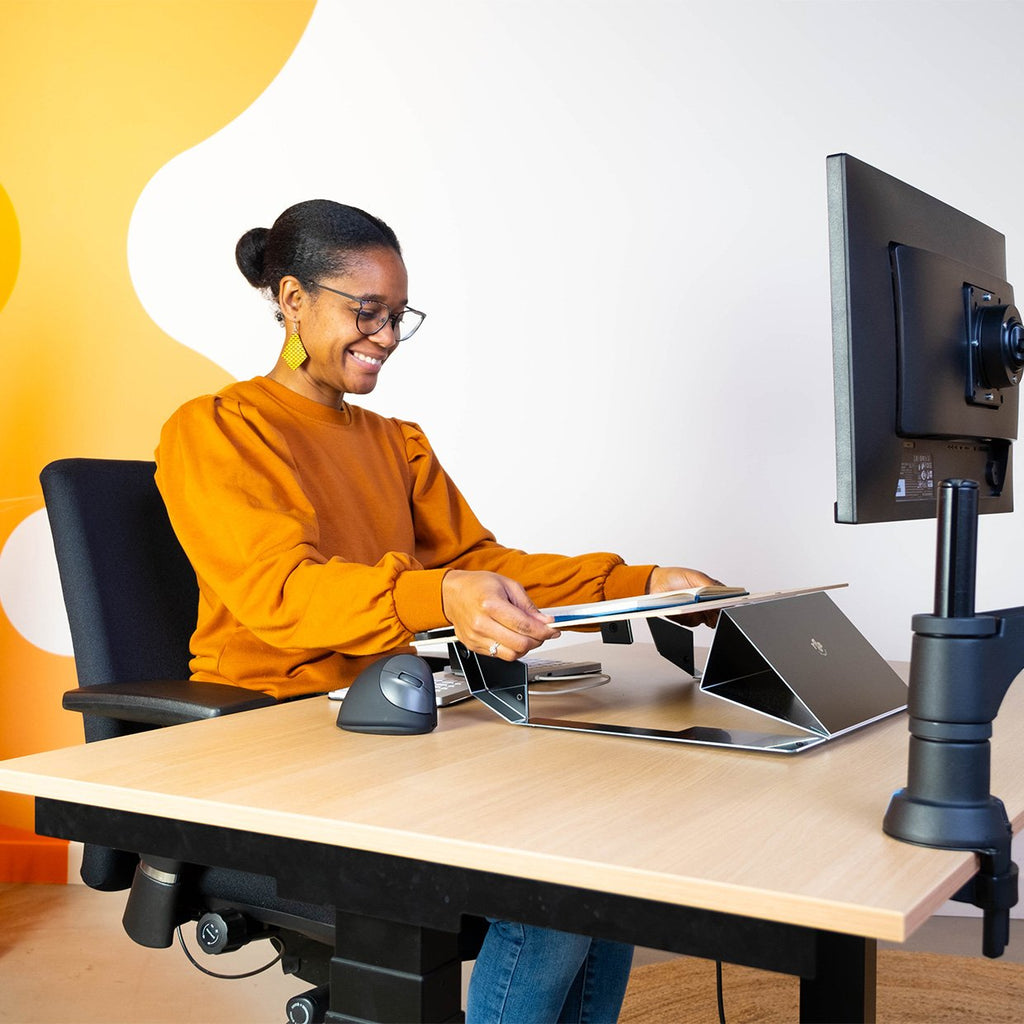 ¿Te gustaría leer en papel entre un trabajo de pantalla y otro? Con el Read2Write, se te anima subconscientemente a trabajar en una postura saludable. Al colocar los documentos delante de ti en lugar de junto al teclado, evitas giros innecesarios. El Read2Write eleva el papel y tiene un ángulo de inclinación, para que puedas leer todo correctamente desde tu silla. Esto te mantiene sentado erguido automáticamente.