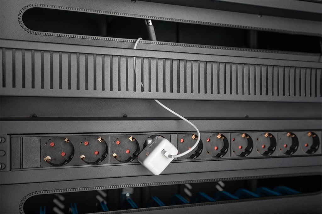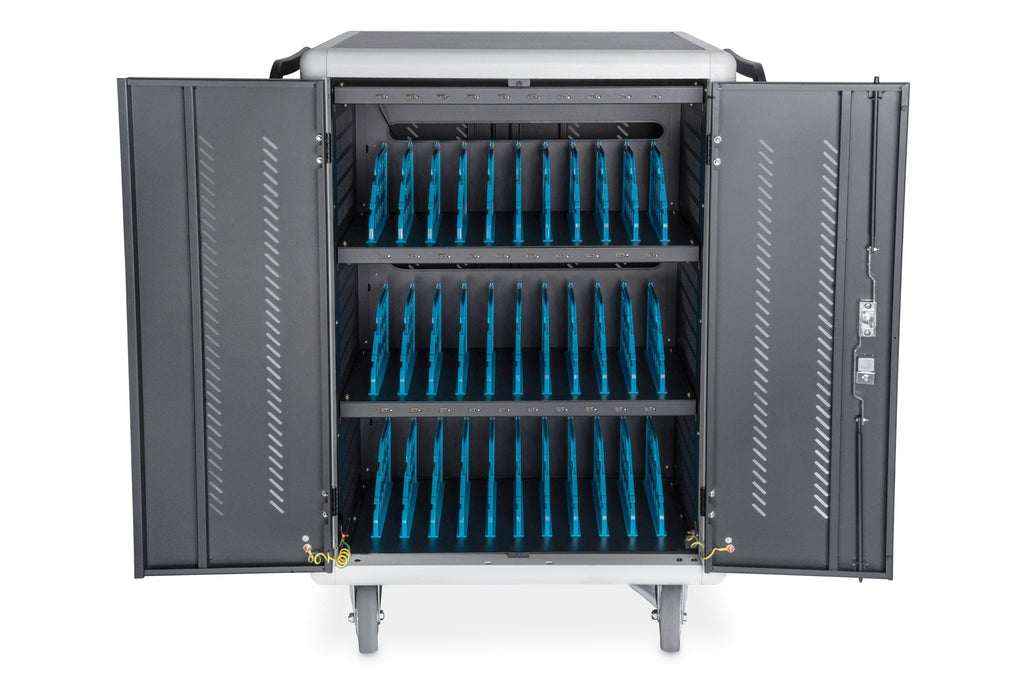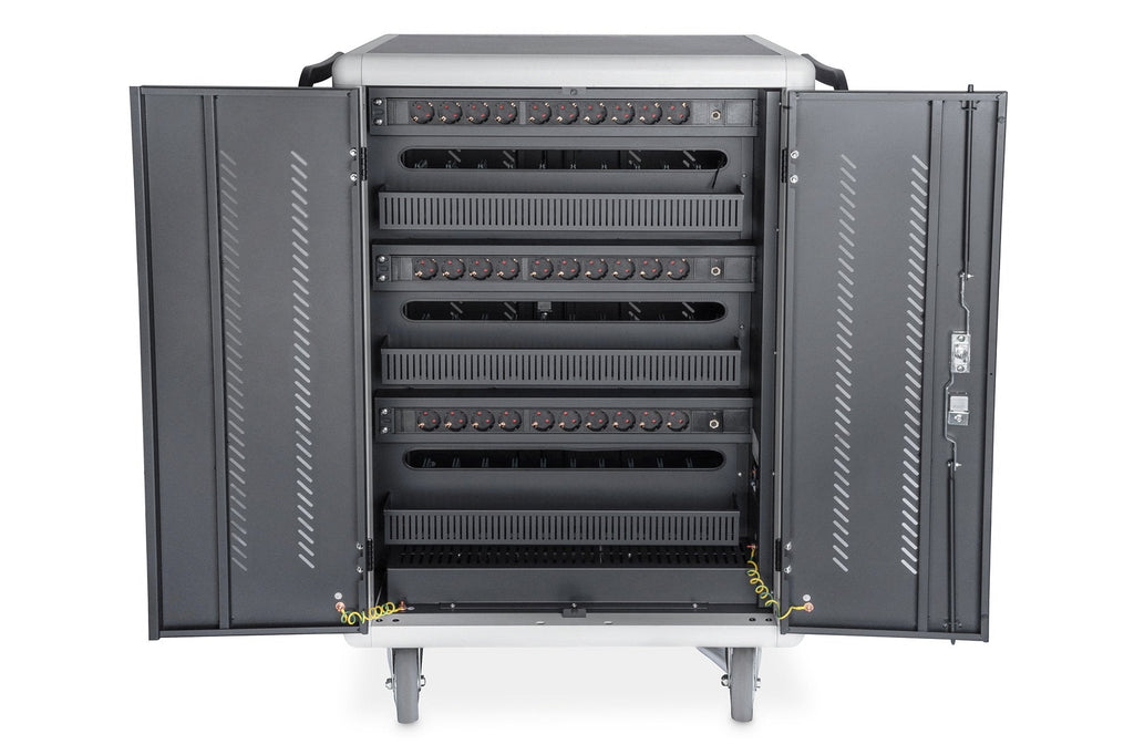 El armario de carga móvil de DIGITUS® es la solución ideal y compacta para guardar y cargar sus dispositivos portátiles, tales como notebooks y tabletas. Los armarios de carga móviles se utilizan con frecuencia en instalaciones públicas, p. ej., escuelas, para poder guardar los dispositivos de forma segura en un lugar central y cargarlos al mismo tiempo. El armario contiene 3 filas de 10 compartimentos de carga, cada uno de los cuales dispone de una conexión USB propia en la parte frontal. Adicionalmente, los dispositivos se pueden conectar con regletas de enchufes instaladas en la parte posterior (3 x 10 con contacto de puesta a tierra). Los conductos para cables y las bandejas para longitudes de cable sobrantes ampliamente dimensionados garantizan la gestión óptima de los cables. Los ventiladores instalados (3 x 24 V) en combinación con las rendijas de ventilación aseguran la disipación de calor activa del armario.