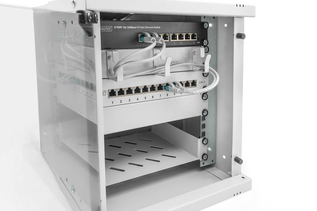 Ya sea en casa, en la oficina o para subdistribuidores con espacio limitado: Con las soluciones compactas de 254 mm (10") de la serie SOHO PRO, podrá instalar su red donde quiera. Disponibles en tres alturas (6U, 9U, 12U), los armarios murales están equipados con una puerta de cristal completa y una entrada de cables en el techo y la base. En el interior hay instalados un par de raíles de perfil galvanizado de 254 mm (10") etiquetados con unidades de altura legibles. Estos pueden ajustarse en profundidad. Cada armario es una robusta construcción de chapa de acero de hasta 1,5 mm de espesor. La coloración se realiza mediante recubrimiento electrostático en polvo en los colores estándar gris (RAL 7035) y negro (RAL 9005). Las bisagras de la puerta pueden cambiarse. Los armarios de red se suministran desmontados en un paquete plano optimizado. El montaje se realiza en pocos pasos y es un juego de niños gracias a las instrucciones paso a paso que se adjuntan.