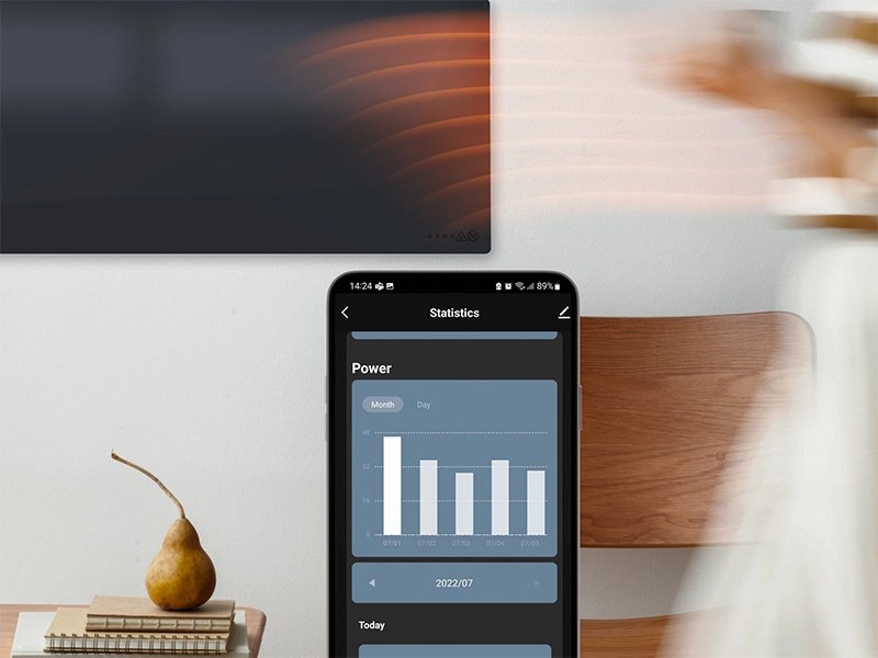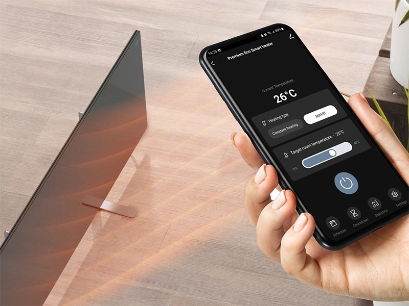 Bajo consumo de energía – de 160 vatios hora a más de 700 vatios hora. Materiales ecológicos – seguro, natural, duradero. Diseño elegante – fino, elección del color. Alta eficiencia energética – distribución uniforme del calor. Sensor de caída para su tranquilidad. Aplicación móvil – ajuste del tiempo, selección de la temperatura de calentamiento de la habitación