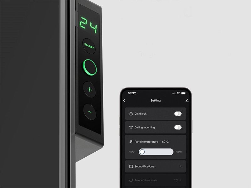 Protección contra la activación accidental por parte de un niño mediante el bloqueo para niños en la aplicación. Ponga la temperatura del panel tan baja como 60 °C para un uso cómodo y seguro
