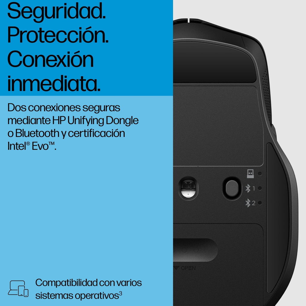 - No importa dónde trabajen tus equipos, conéctate de forma fluida y segura. Diseñado para Intel Evo™, compatible con varios sistemas operativos[3] y se empareja mediante el HP Unifying Dongle o Bluetooth. Cambia de dispositivo con un solo clic para sincronizar de forma sencilla los espacios de trabajo.