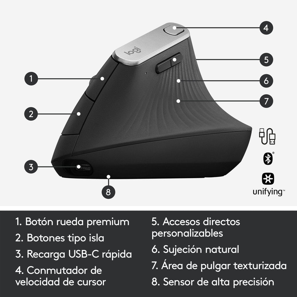 - FORMA CÓMODA Y SUPERFICIE TEXTURIZADA – MX Vertical tiene una forma pensada para la mano humana y es suave al tacto. Su contorno único se adapta a diversas formas y tamaños de mano, y la superficie de goma con textura garantiza un agarre natural