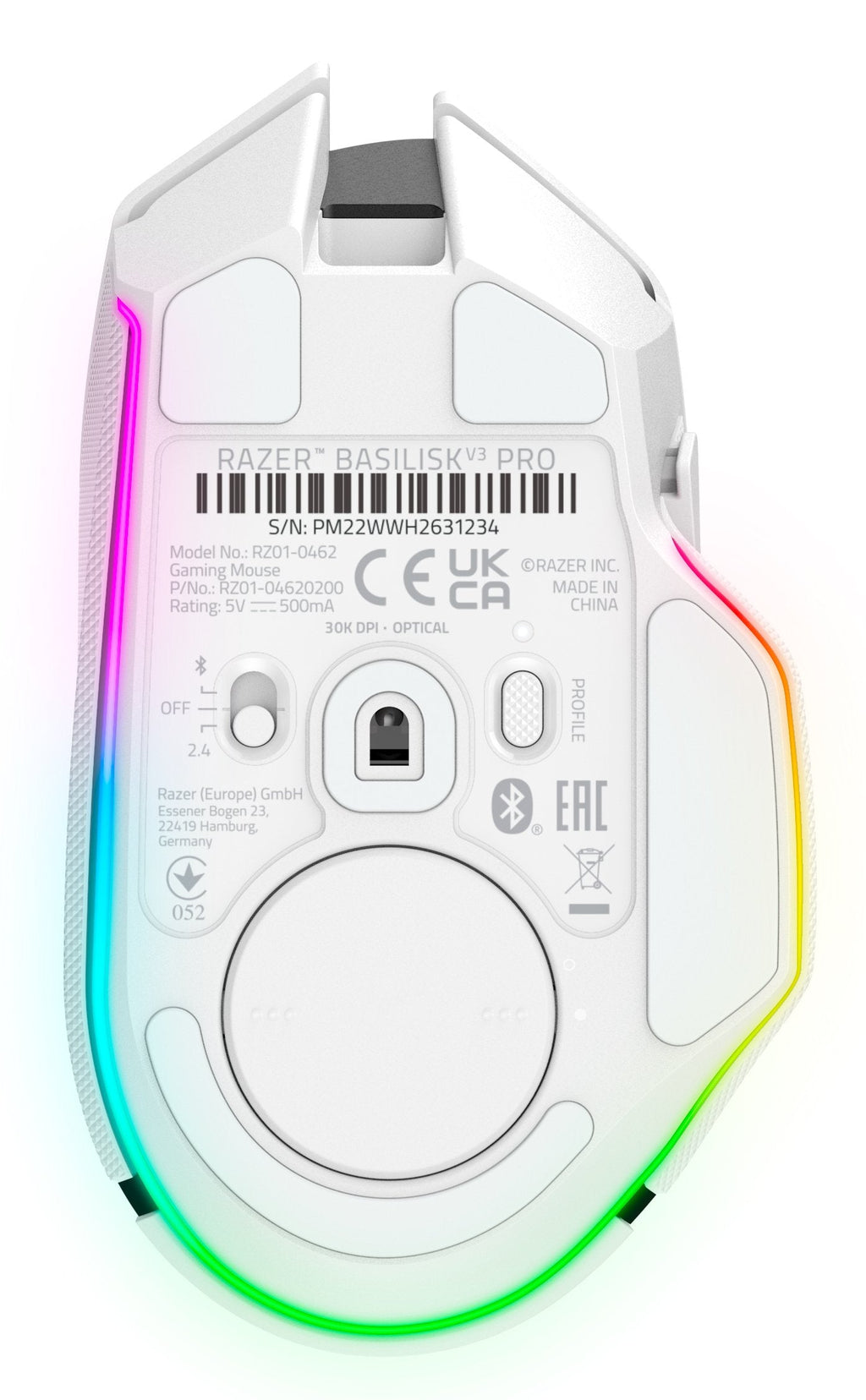 Razer Basilisk V3 Pro, mano derecha, Óptico, RF Wireless + Bluetooth + USB Type-C, 30000 DPI, Blanco