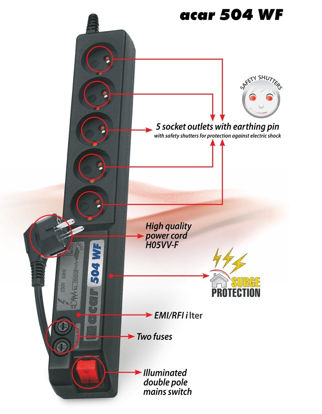 ACAR 504WF, 5 salidas AC, 230 V, 50 Hz, 10 A, 2300 W, 10 A