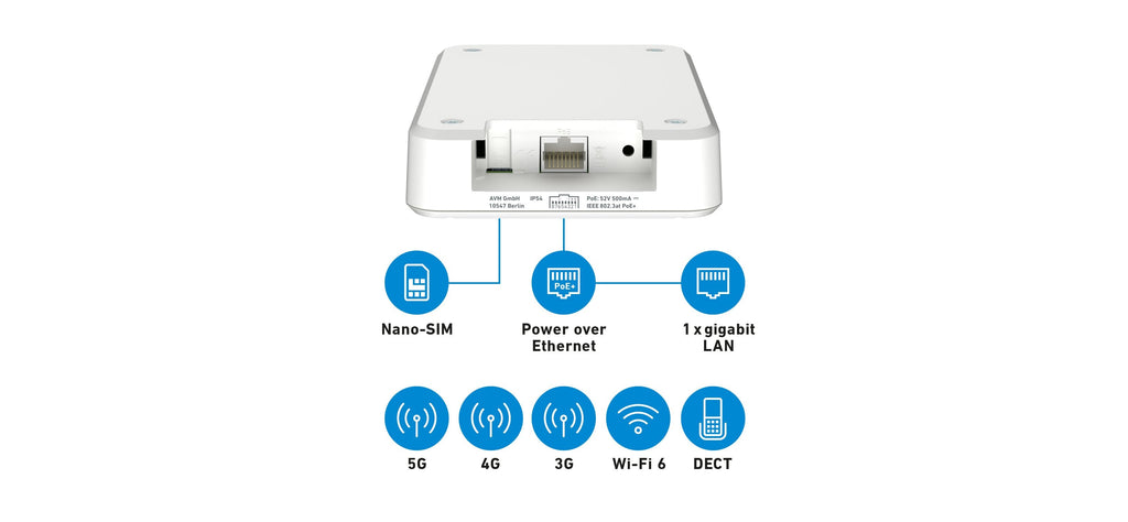 El FRITZ!Box 6860 5G Edition International, este Router móvil lleva la red 5G de Internet móvil a la red local inalámbrica, ultrarrápido con hasta 1,3 Gbps, compatible tanto con 5G (NSA, SA) como con LTE. Su potente Wi-Fi Mesh con Wi-Fi 6, distribuye los datos de forma inalámbrica por toda la casa a una velocidad de hasta 3 Gbps. Diseño compacto, con alimentación eléctrica (PoE+) se puede utilizar tanto en interiores como en exteriores, 1 Puerto LAN Gibagit y la centralita VoIP con estación base DECT para conexión de dispositivos de domótica y telefonía, complementan la oferta versátil de comunicación.