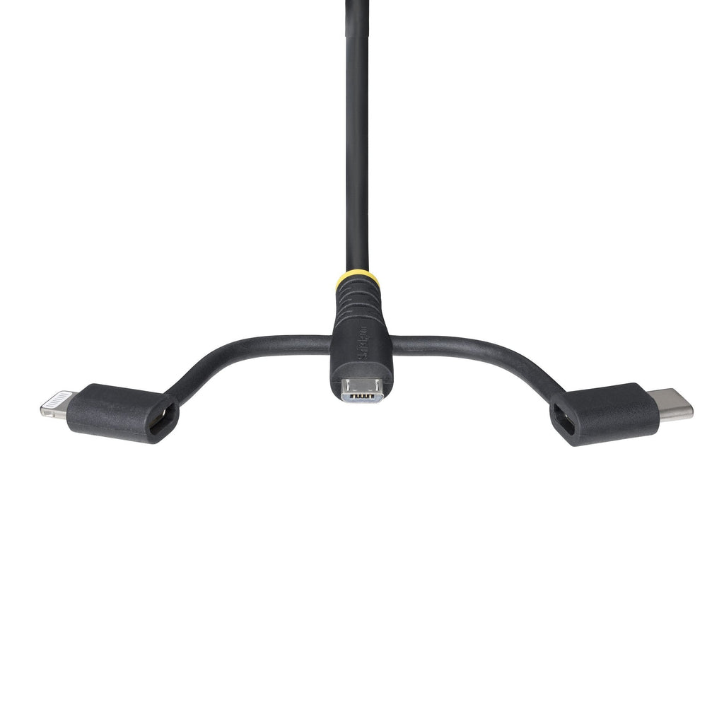 Conecte un dispositivo Apple Lightning, USB-C o Micro-USB mediante este cable resistente 3 en 1 diseñado para un uso frecuente