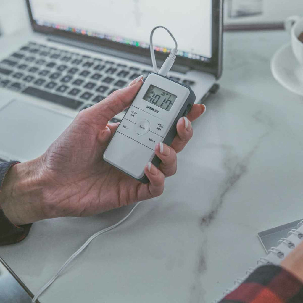 La DT-140 es su compañera de viaje. El formato es de lo más sencillo: auriculares, un cable USB, un clip para el cinturón y, por supuesto, la radio Tiene la opción de buscar automáticamente las emisoras de radio disponibles, así que conecte los auriculares y listo.