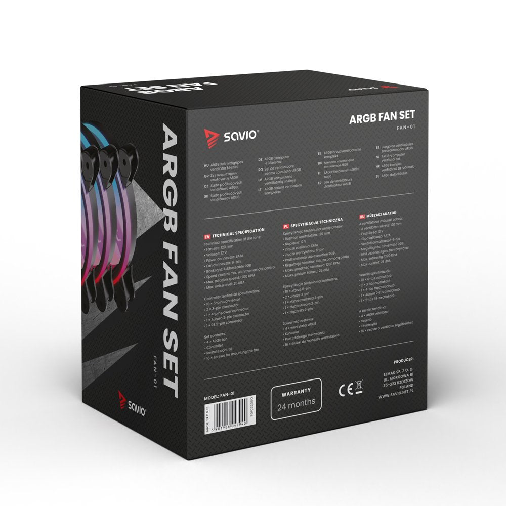 Savio FAN-01 4-pack 120mm ARGB fan including controller and remote control Carcasa del ordenador Ventilador 12 cm Negro 4 pieza(s)