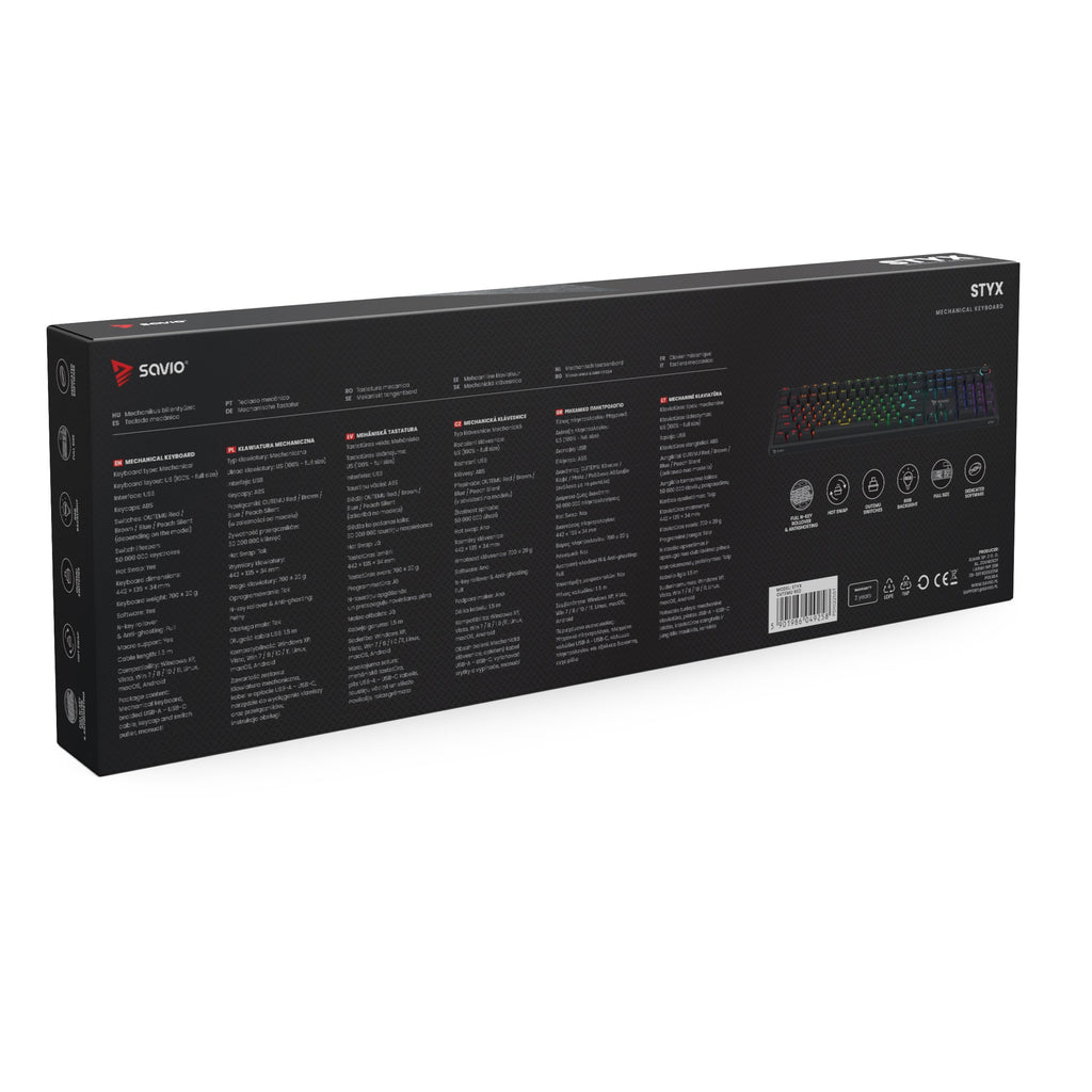 Savio STYX Outemu Blue, Hot Swap, RGB, Alámbrico, USB, Mem-chanical key switch, QWERTY, LED RGB, Negro
