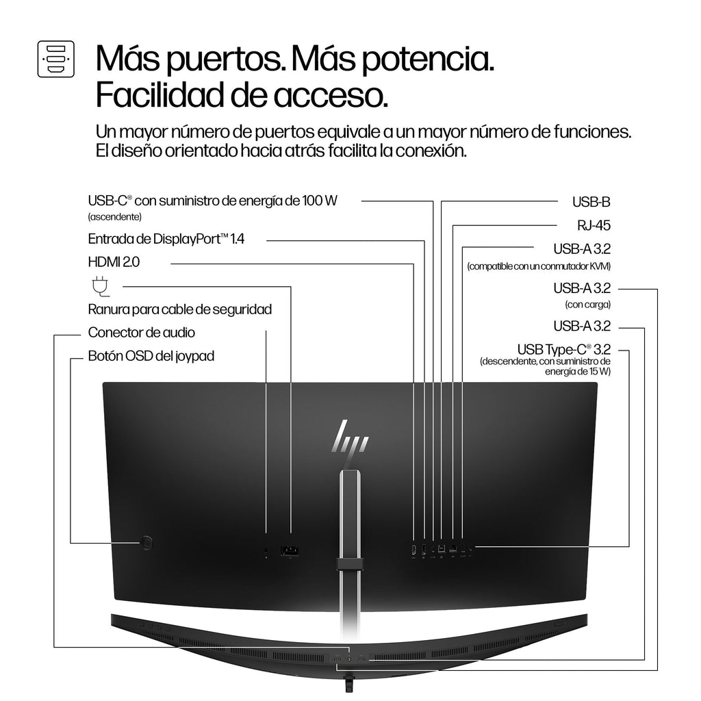 - Siéntete lo mejor posible durante todo el día gracias a 3 modos de ajuste, un diseño sin bordes en 3 lados, un sensor de luz ambiental y HP Eye Ease en una pantalla ultra ancha.