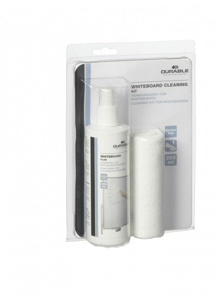 Juego de limpieza para el cuidado y la limpieza de pizarras blancas. El líquido limpiador limpia y protege la superficie de la pizarra blanca y elimina la tinta de rotuladores de pizarras blancas que se borran en seco, grasa y suciedad. Incluye paño de microfibra de alta calidad de 25 x 25 cm.