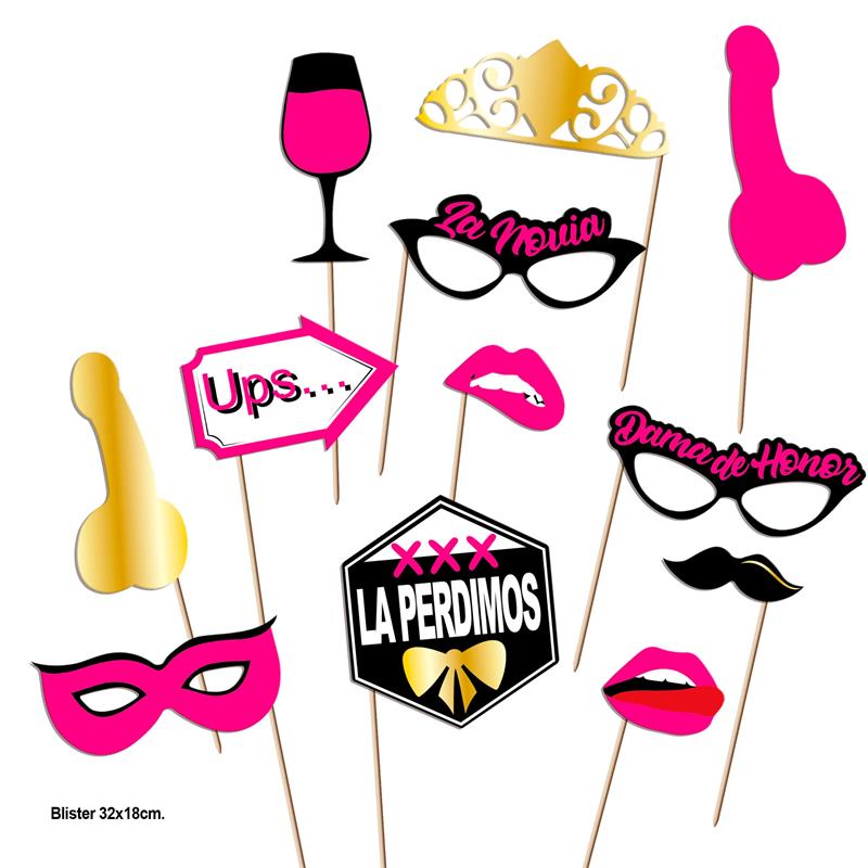 Original set de accesorios para el Photocall que incluye 12 divertidos accesorios.