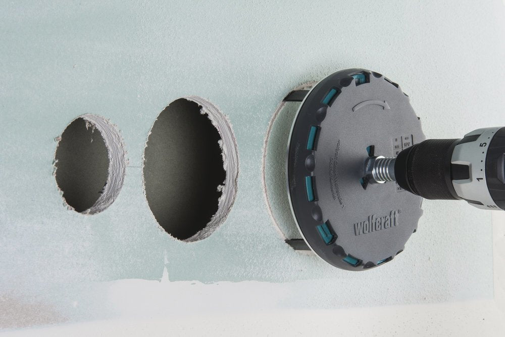 Con esta sierra de corona ajustable puede reproducir todos los orificios de 45 a 130 mm. Un solo producto para multitud de diámetros. Los tres grupos de tres dientes sierran fácilmente las placas de yeso y las placas de madera blanda y, con sus dientes especiales trabados, garantizan cortes finos y limpios. El ajuste del tamaño se realiza en 3 simples pasos: aflojar, ajustar de forma sincronizada, fijar. La escala milimétrica integrada y otras escalas para diámetros de montaje comunes ayudan a encontrar el radio correcto de un vistazo. La zona de trabajo está protegida por el gran plato de perforación. Las aberturas suficientemente grandes apartan el polvo durante la rotación de manera fiable y evitan que se fije en el cuerpo de la broca. De esta manera, la función de la mecánica de ajuste está garantizada a pesar de la elevada generación de polvo.