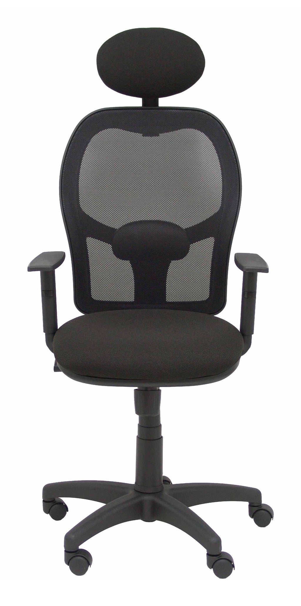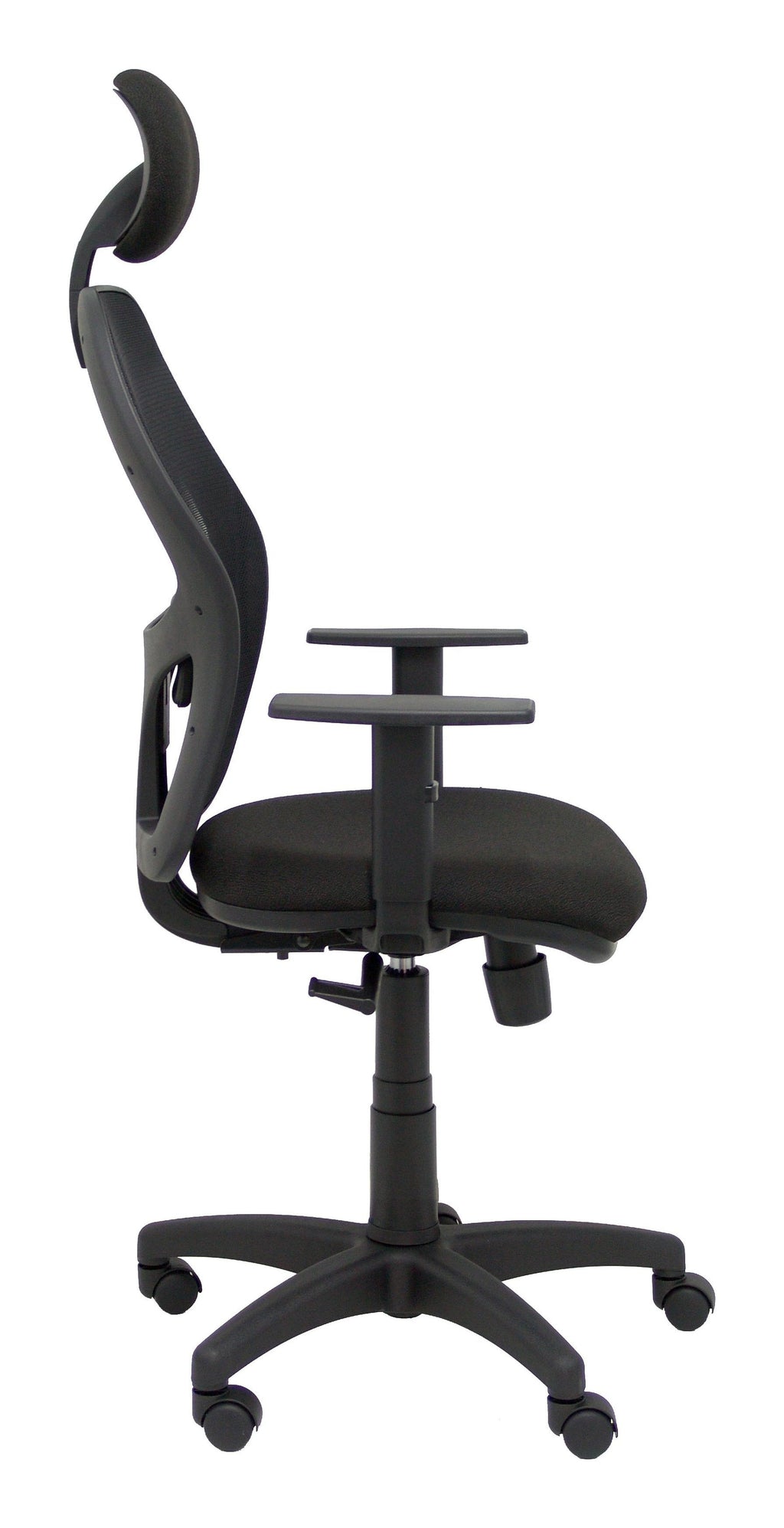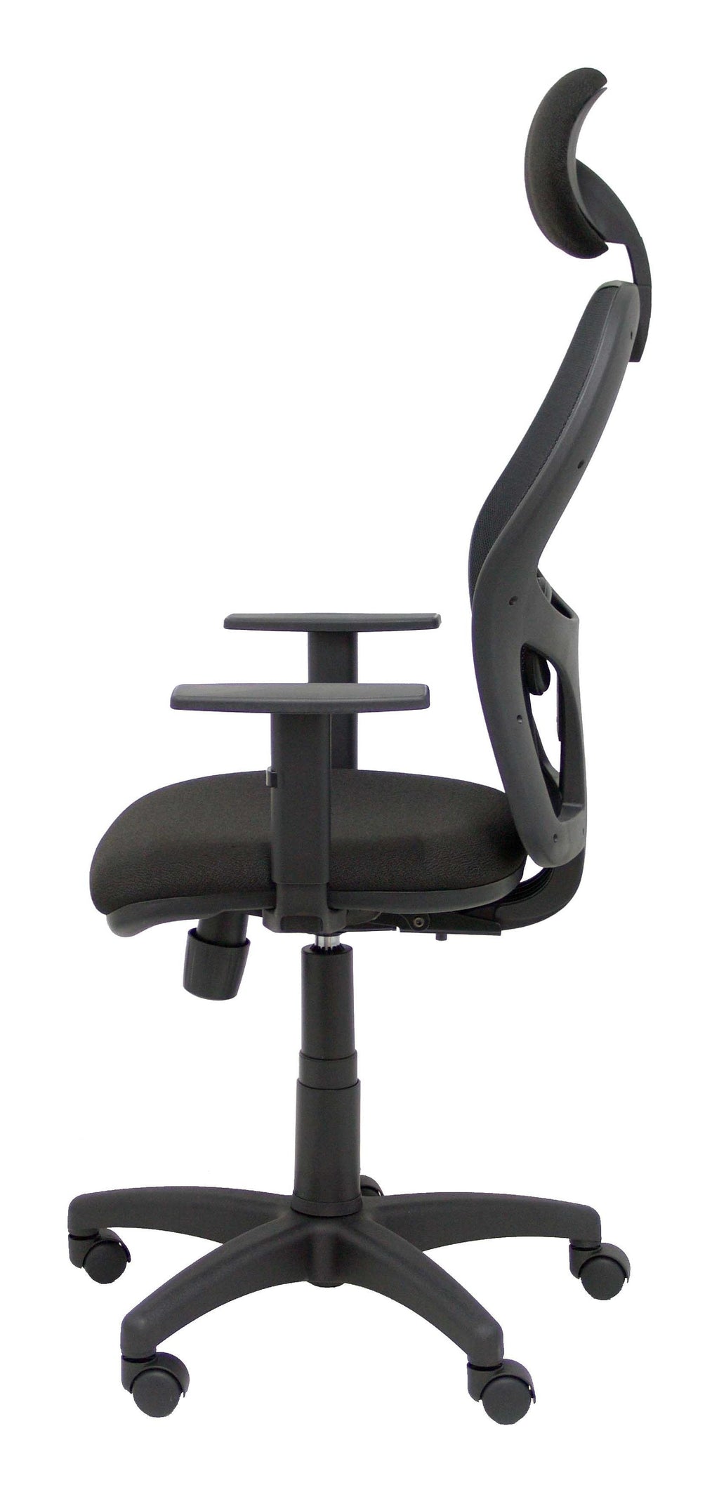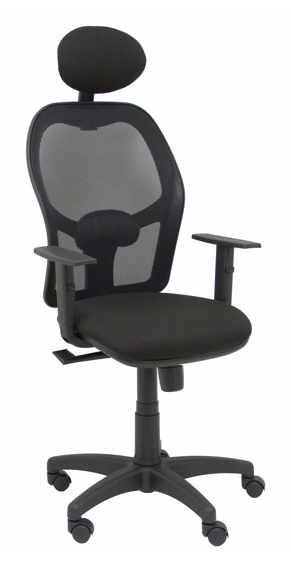 PIQUERAS Y CRESPO Modelo Alocén - Silla de oficina ergonómica con mecanismo sincro, brazos regulables y ajustable en altura - Respaldo de malla transpirable en color negro con cabecero fijo y asiento tapizados en tejido BALI color negro.