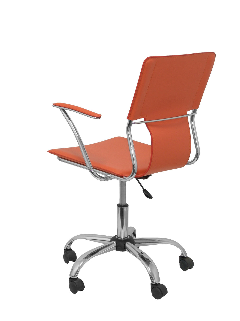 Silla de oficina ergonómica, regulable en altura y giratoria 360º. Silla de oficina de elegante diseño, su estructura cromada y su tapizado en similpiel la hace idónea para cualquier tipo de oficina y para el hogar. También es buena para la habitación de los niños. Respaldo ergonómico para una mayor adaptación a la espalda. Asiento ergonómico y acolchado para una mayor comodidad del usuario. Asiento hecho con madera laminada de 10 mm de espesor. Espuma de 10 mm de espesor y 36 kg/m3 de densidad. Asiento y respaldo tapizados en similpiel color naranja. Brazos fijos cromados con pastilla acolchada tapizada en similpiel color naranja. Chásis cromado. Regulable en altura mediante cilindro de gas. Giratoria 360º. Gas cromado. Base cromada de alta resistencia de 5 radios. Ruedas de nailon