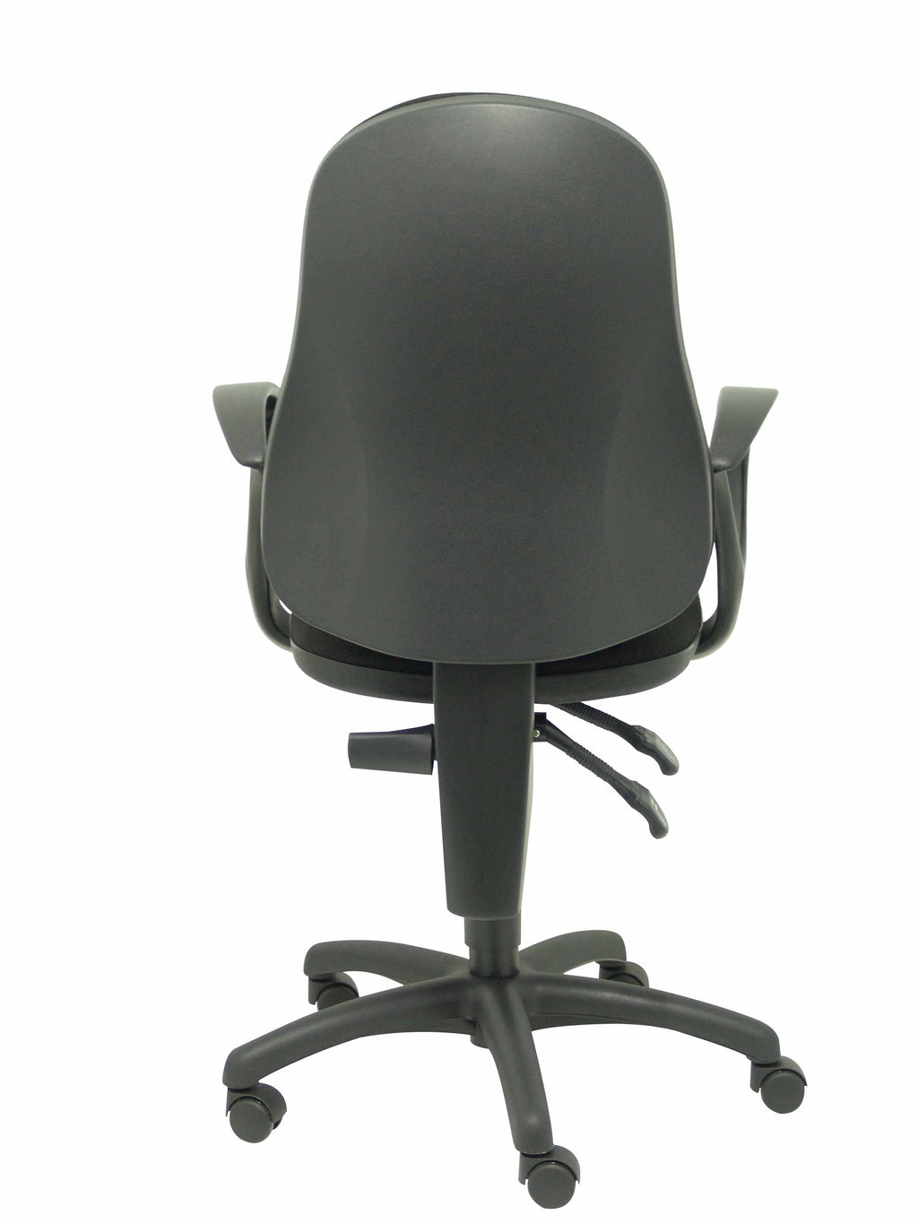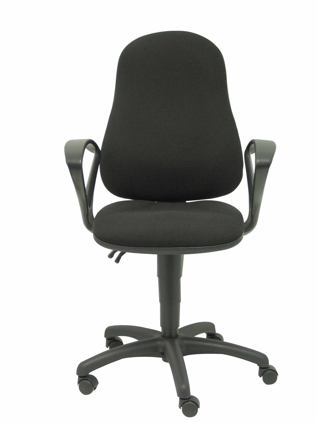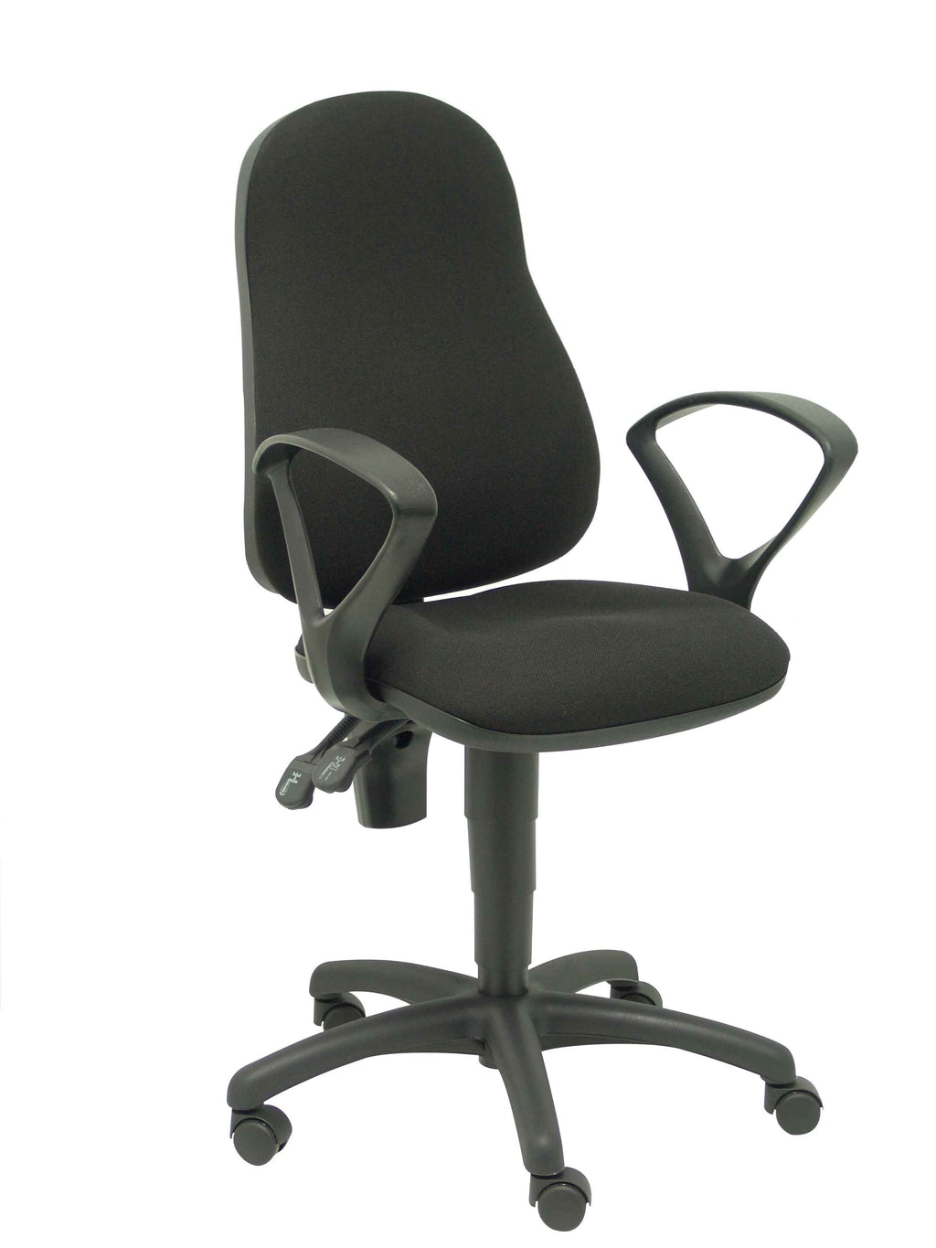 Asiento y respaldo tapizados en tejido ARAN color negro. Brazos fijos incluidos. Mecanismo de contacto permanente de doble maneta. Regulación del respaldo en altura e inclinación. Regulable en altura mediante cilindro de gas. Giratoria 360º. Telescópico color negro. Base poliamida de alta resistencia de 5 radios y 60 cm de diametro, en color negro. Ruedas autofrenantes de nailon. Favorece una buena postura integral para evitar posibles problemas de espalda. Ergonómica.