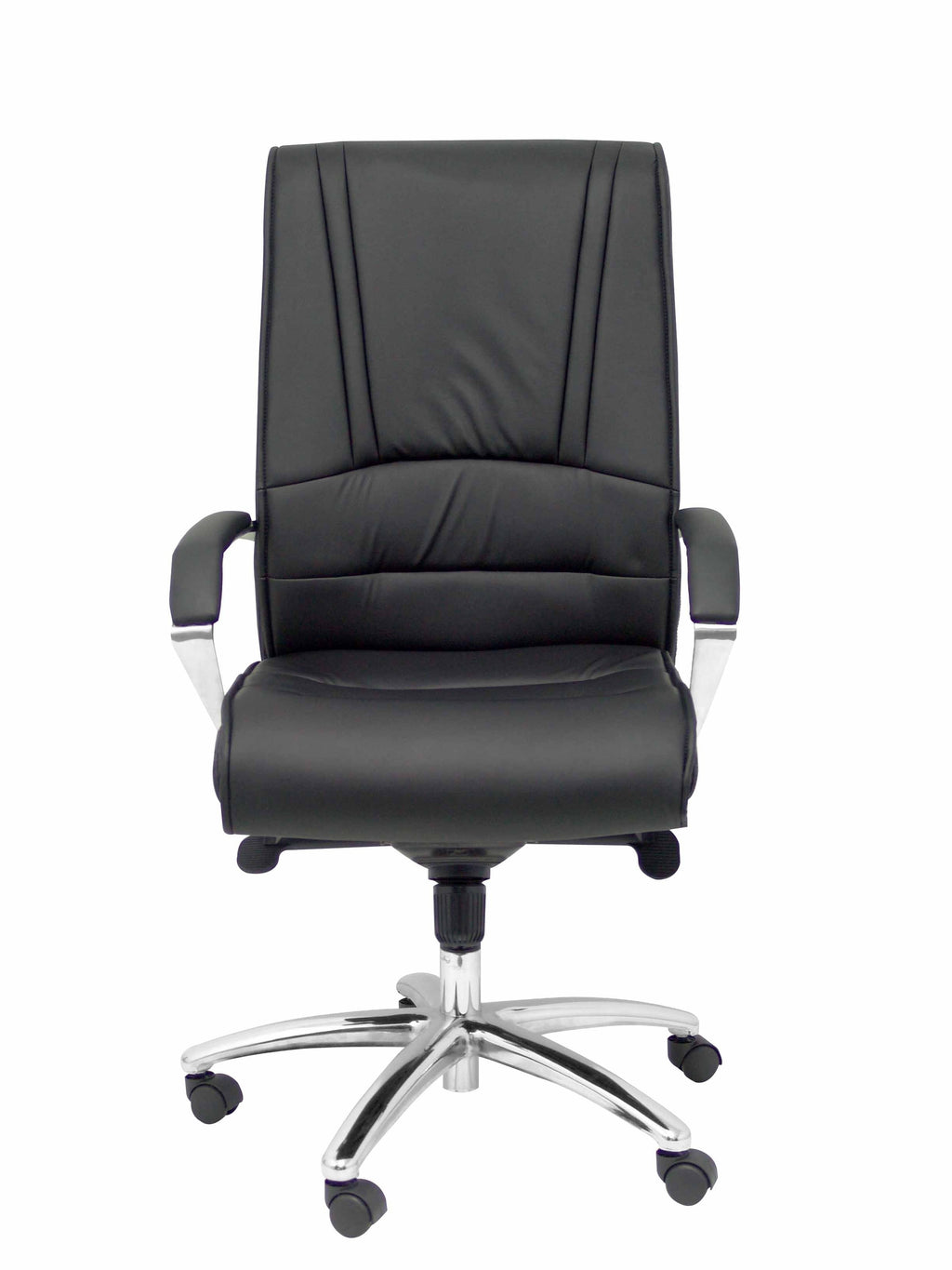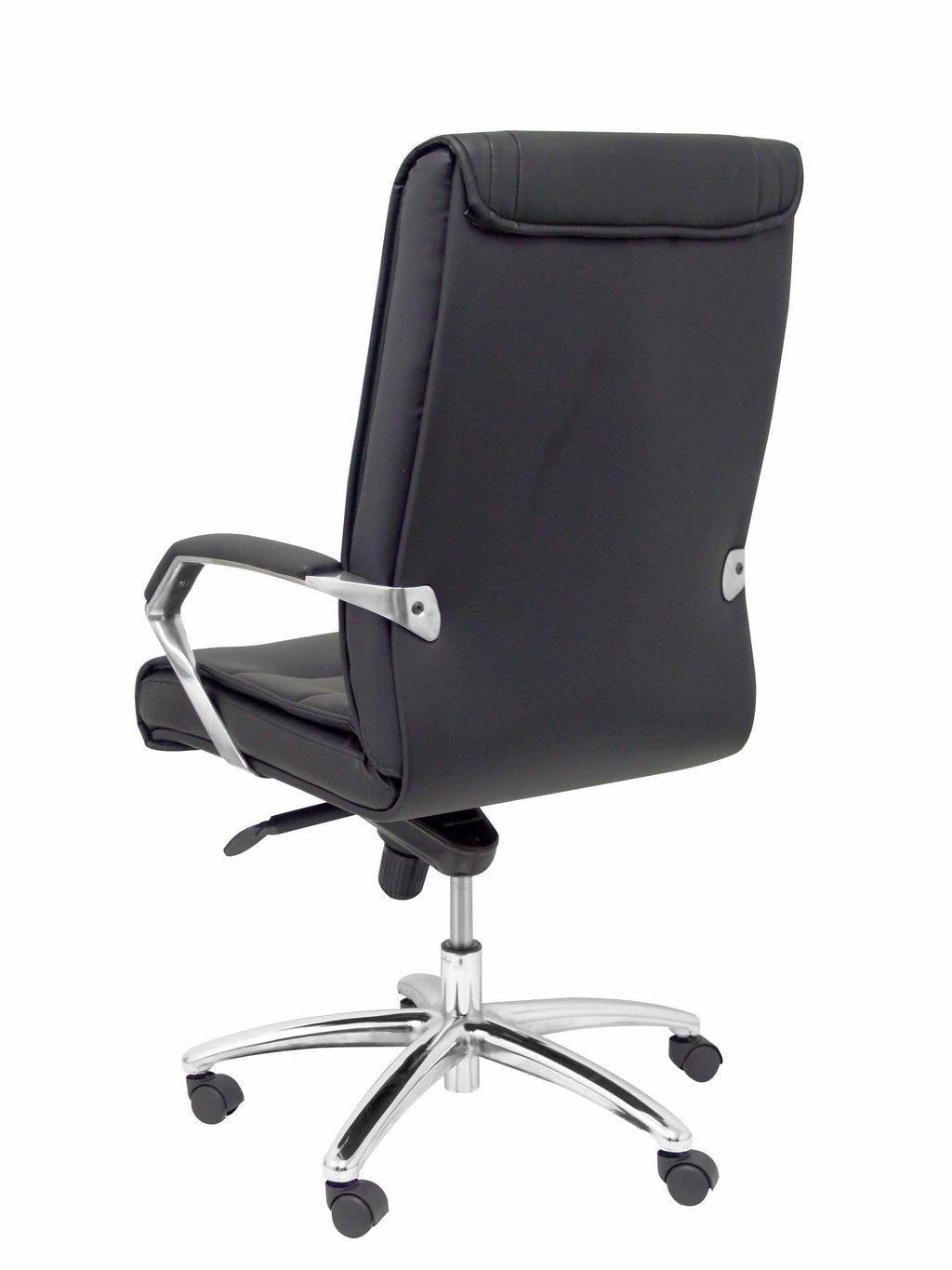 Respaldo medio ergonómico y acolchado que proporciona una mayor adaptabilidad a la espalda (con acolchado en la zona de la cabeza). Hecho con madera laminada de 8 mm de grosor y acolchado de espuma de 6 cm de grosor y 25 kg/m3 de densidad. Asiento ergonómico y acolchado para una mayor comodidad del usuario para las largas horas de trabajo. Hecho de madera laminada de 8 mm de grosor y acolchado de espuma de 6 cm de grosor y 25 kg/m3 de densidad. Asiento y respaldo tapizados en similpiel color negro de primera calidad. Brazos fijos de aluminio pulido, con pastilla acolchada