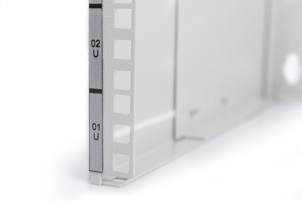 El soporte para el montaje de pared se utiliza para instalar componentes de 483 mm (19"). De acuerdo con los requisitos de espacio individuales, están disponibles en varias unidades de rack. La profundidad ajustable (de 225 a 399 mm) también permite realizar instalaciones de componentes más grandes. Una amplia zona perforada en la parte posterior se puede utilizar para la gestión de los cables, si, por ejemplo, los cables salen directamente de la pared.