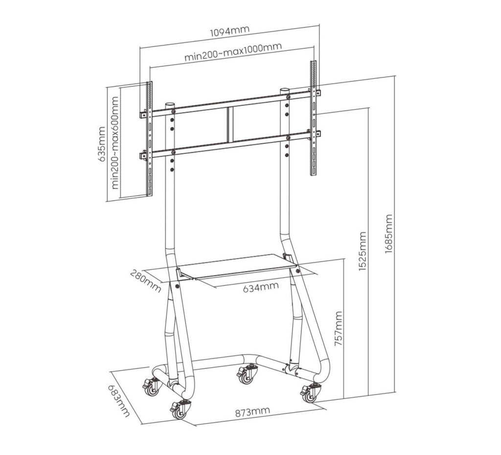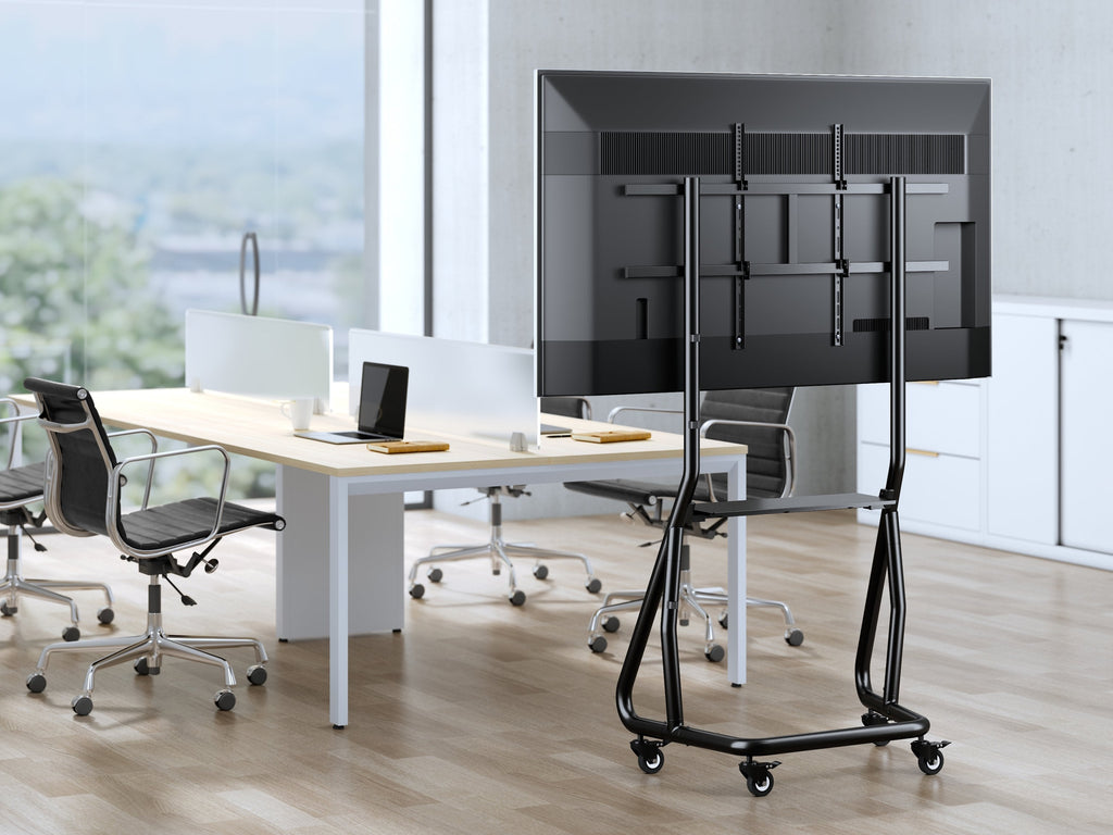 Las ruedas con bloqueo hacen que los carros de TV sean fáciles de mover y detener. La gestión interna de cables oculta los cables de la vista para mantener una apariencia libre de desorden. Ideal para conferencias, exposiciones públicas u otras presentaciones profesionales."