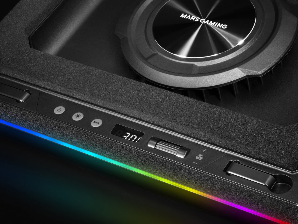 La MNBC-ULTRA incorpora un panel de control intuitivo que te permite ajustar la velocidad del ventilador mediante una rueda de control precisa, adaptando el rendimiento de refrigeración a cada situación. Además, cuenta con un botón dedicado para controlar la iluminación RGB Chroma de la base, ofreciéndote una experiencia visual totalmente personalizable con solo un toque. Todo el control, sin distracciones.