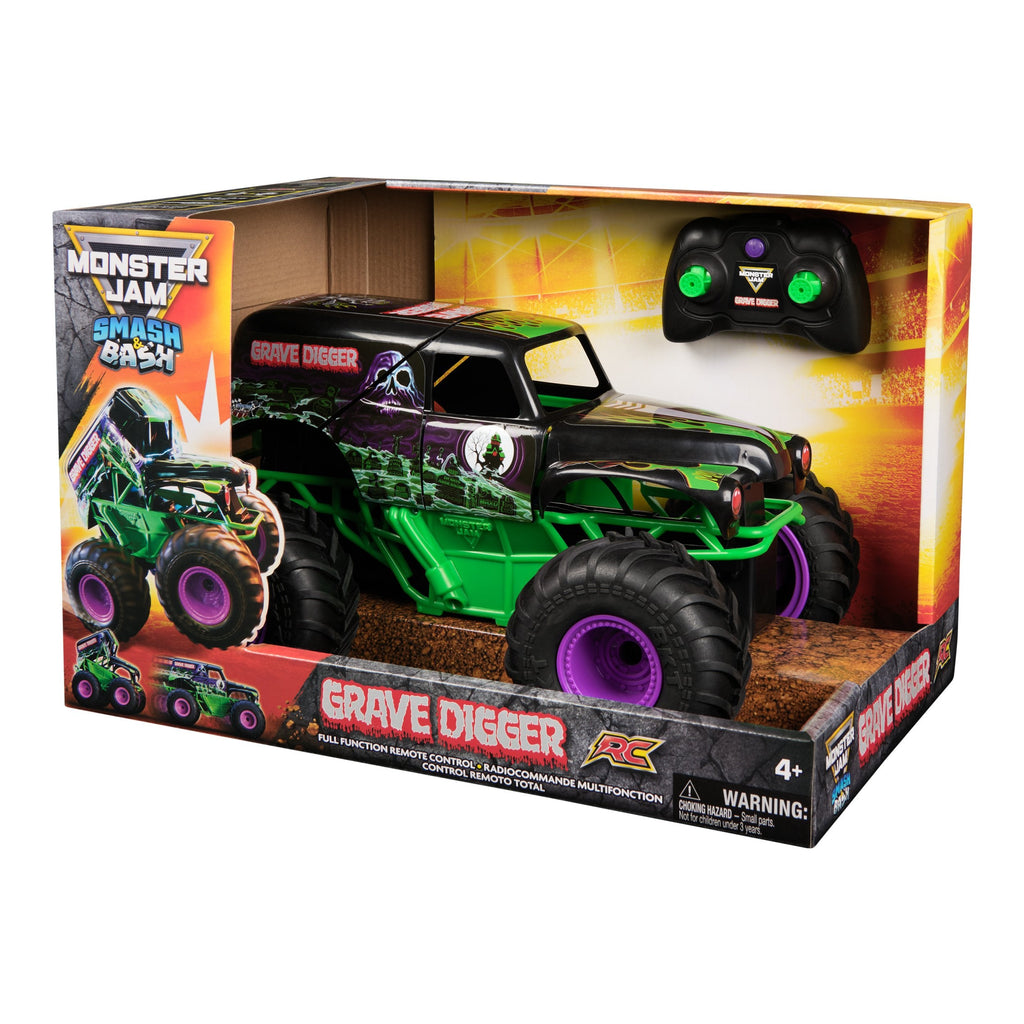- Smash & Bash Grave Digger por control remoto: El estilo de este camión monstruo por control remoto a escala 1:15 es fiel al de Grave Digger, con neumáticos de caucho suave y carrocería resistente con multitud de detalles, para que disfrutes de un juego de alto impacto