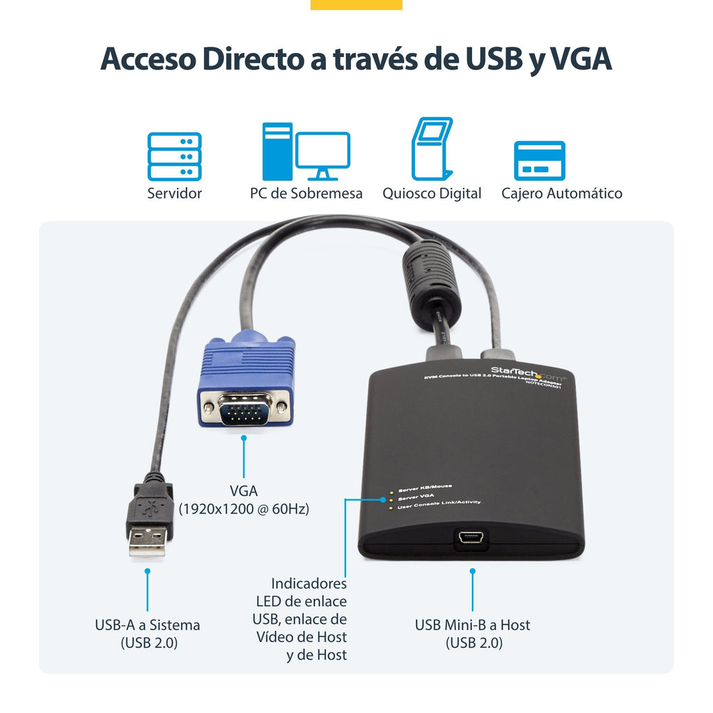 El adaptador de crash cart para ordenador portátil consola KVM a USB 2.0, modelo NOTECONS01, convierte su notebook o netbook en crash cart portátil para servidor, lo cual evita que haya que cargar de un lado a otro un monitor grande y pesado, un teclado y un ratón. Este adaptador ofrece transmisión de la señal VGA desde cualquier ordenador anfitrión a un ordenador portátil, y además emula las salidas de teclado y ratón del ordenador portátil para facilitar el acceso y control de los servidores, ordenadores u otros dispositivos "sin periféricos" conectados. "El conmutador KVM USB de StarTech.com puede convertirse en su mejor aliado durante sus visitas al centro de datos... puede utilizarlo desde la parte trasera del rack. Así que si tiene que resolver problemas que requieran mover cables o conexiones de red... esta puede ser una gran solución que le ahorre tiempo."
