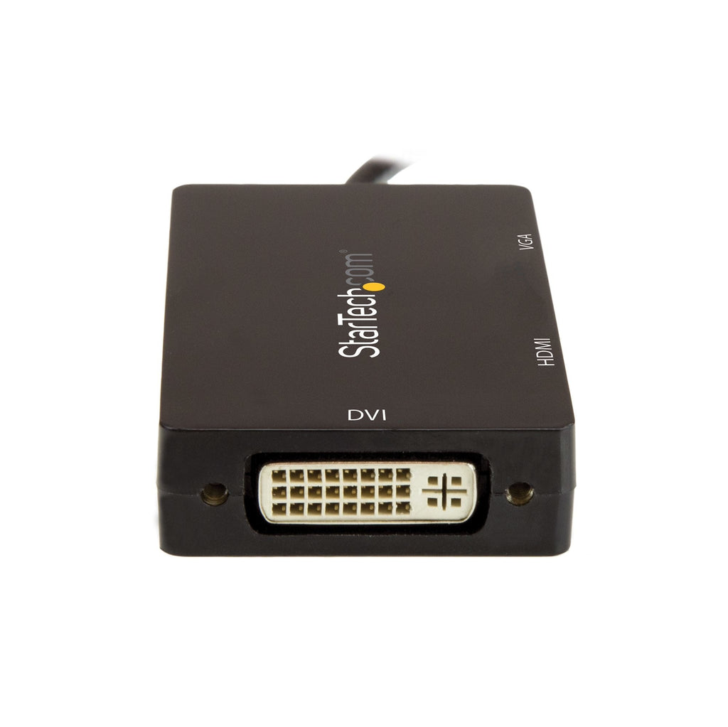 Este adaptador de vídeo multipuerto USB-C™ constituye una solución para conectar su ordenador portátil equipado con USB Type-C a su pantalla VGA, DVI o HDMI®. Conectividad de vídeo todo en uno, con los viajes en mente Evite las molestias de tener que llevar diferentes adaptadores para pantallas diferentes, gracias a este adaptador USB-C 3 en 1. Con salidas VGA, DVI y HDMI, podrá conectar su ordenador portátil a casi cualquier pantalla. Asombrosa calidad de imágenes La salida HDMI de este adaptador de vídeo USB-C es compatible con las resoluciones UHD 4K, las cuales ofrecen cuatro veces la calidad de imagen que ofrece la resolución de alta definición de 1080p.Todas las salidas (HDMI, VGA, DVI) son compatibles con resoluciones de alta definición de hasta 1920 x 1200. Máxima portabilidad El práctico «dongle» (llave) USB-C plug-and-play es el accesorio ideal de viaje. Ya que cabe cómodamente en la bolsa de su ordenador portátil y le ofrece tres opciones de salida de vídeo, el adaptador de vídeo USB-C es la solución ideal para aplicaciones tipo BYOD (Trae tu propio dispositivo), donde quiera que vaya.