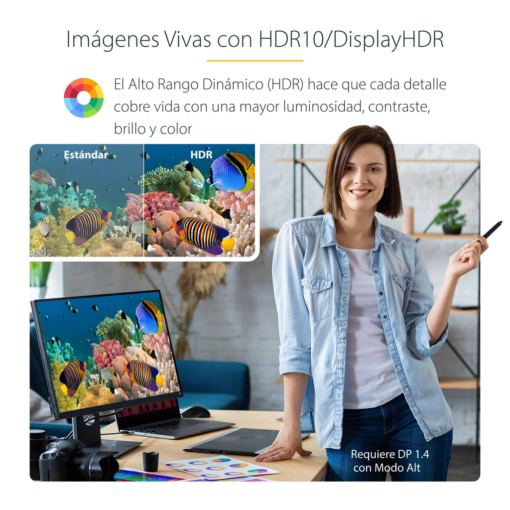 - ALTO RENDIMIENTO: Adaptador USB-C a Mini DisplayPort 1.4 (32,4Gbps) compatible con HDR/DisplayHDR, HBR3, Display Stream Compression (DSC), HDCP 2.2/1.4; 8K 60Hz (7680x4320), 5K 60Hz, 4K 120Hz y 1080p
