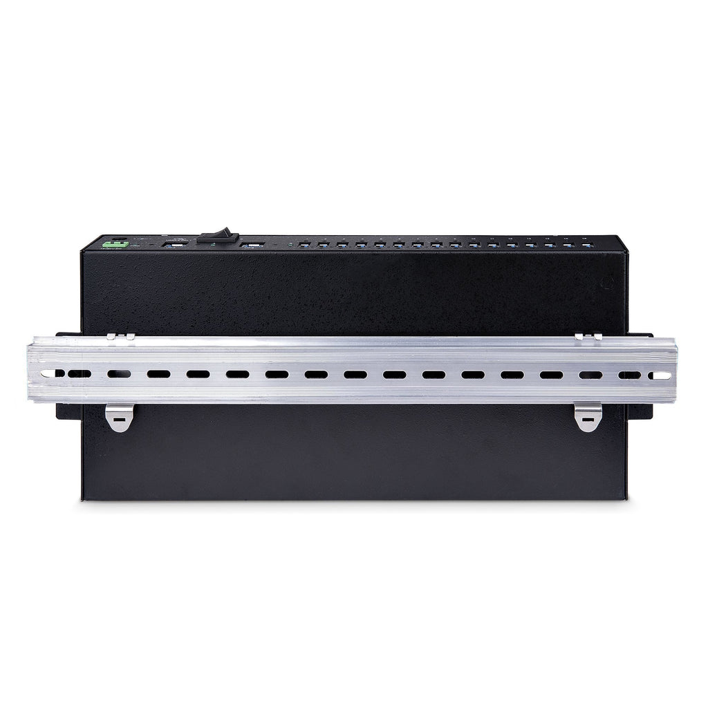 Añada 16 puertos USB 3.2 Gen 1 (5 Gbps) a dos ordenadores host, utilizando este hub industrial montable en carril DIN/superficie/rack