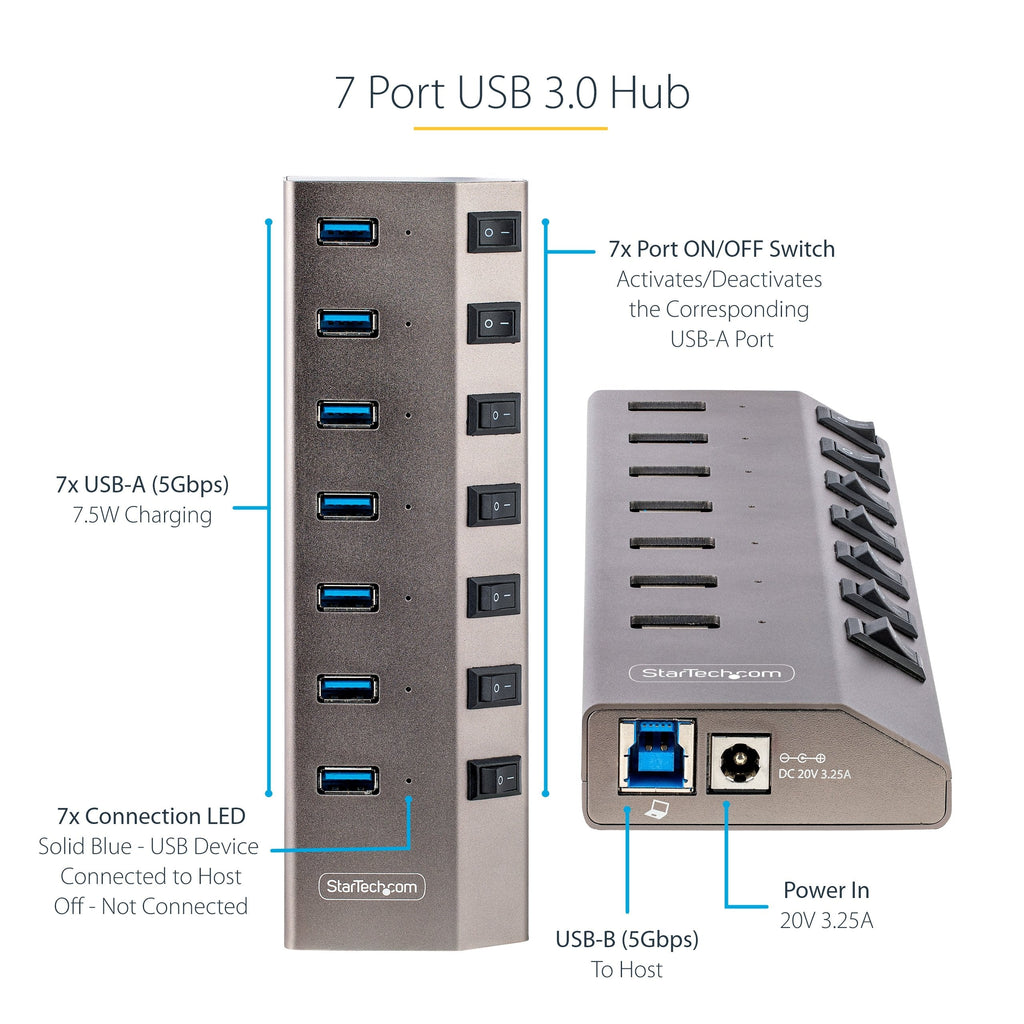 - HUB USB de 7 PUERTOS a 5 Gbps: Amplíe la conectividad de su ordenador USB Tipo-C o USB Tipo-A añadiendo 7 puertos USB-A con interruptores individuales de puerto - USB 3.2/3.1 Gen 1 (5 Gbps) - HUB autoalimentado con adaptador de 65W incluido