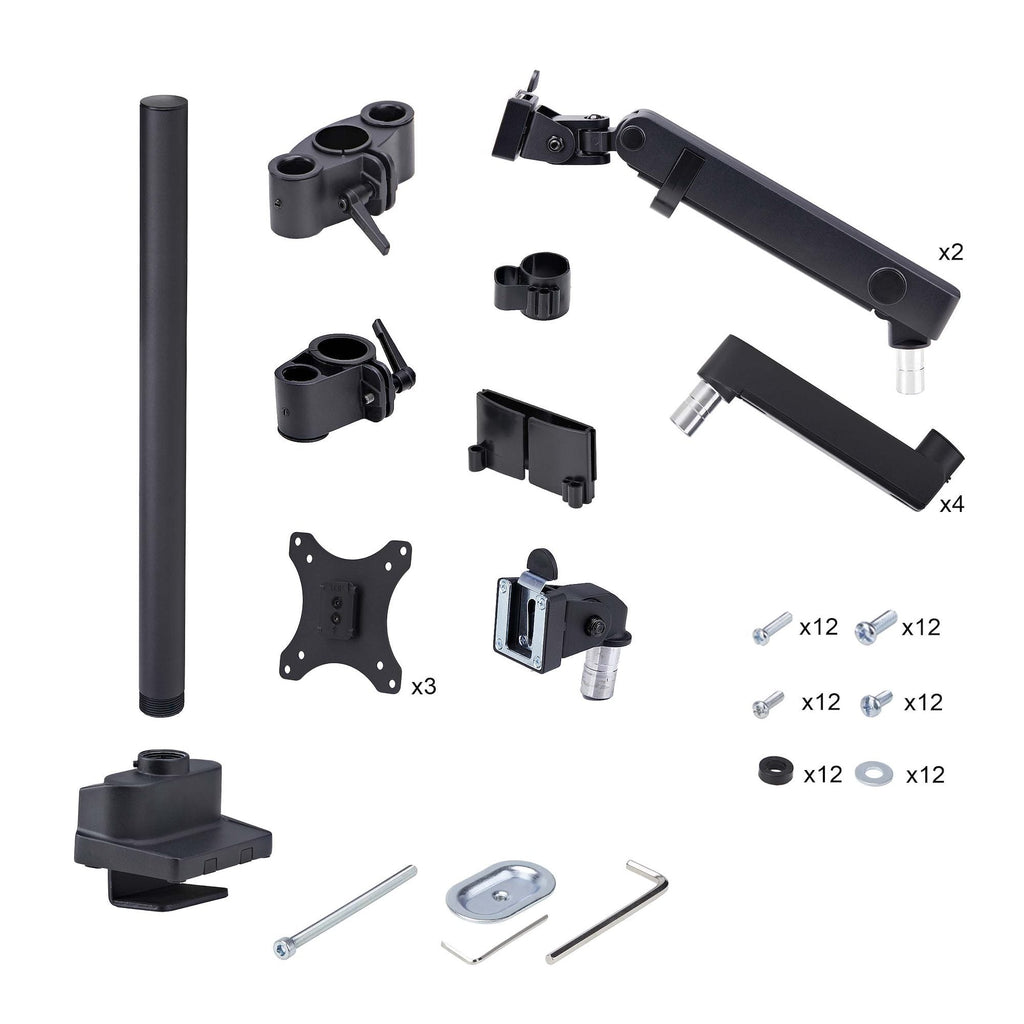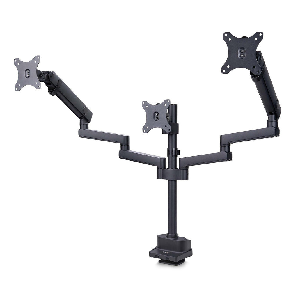 - BRAZO PARA MONITOR DE MONTAJE EN ESCRITORIO: Soporte VESA para tres monitores (75x75/100x100 mm) que admite pantallas de 27 pulgadas de hasta 7kg - Brazos de acero articulados y ajustables en altura - Abrazadera en C/ ojal