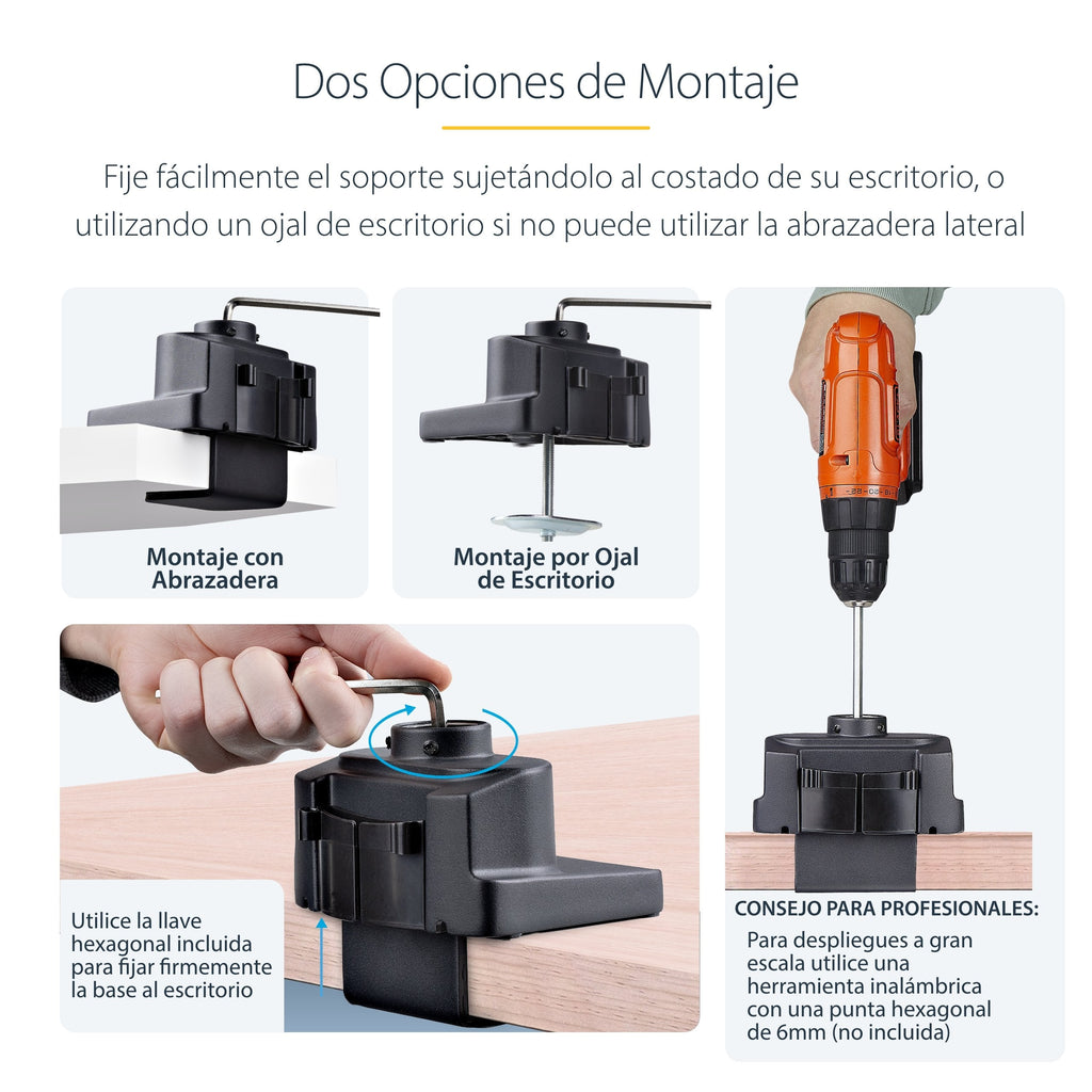 La exclusiva abrazadera de escritorio de tornillo superior simplifica la instalación al permitir a los usuarios apretar la abrazadera manualmente desde arriba utilizando una llave hexagonal o un taladro manual, eliminando la necesidad de pasar por debajo del escritorio. Además, la abrazadera de escritorio está diseñada con una abrazadera en C intercambiable y una montura de ojal para adaptarse a escritorios de hasta 50mm de grosor, lo que proporciona flexibilidad para diferentes configuraciones de escritorio.