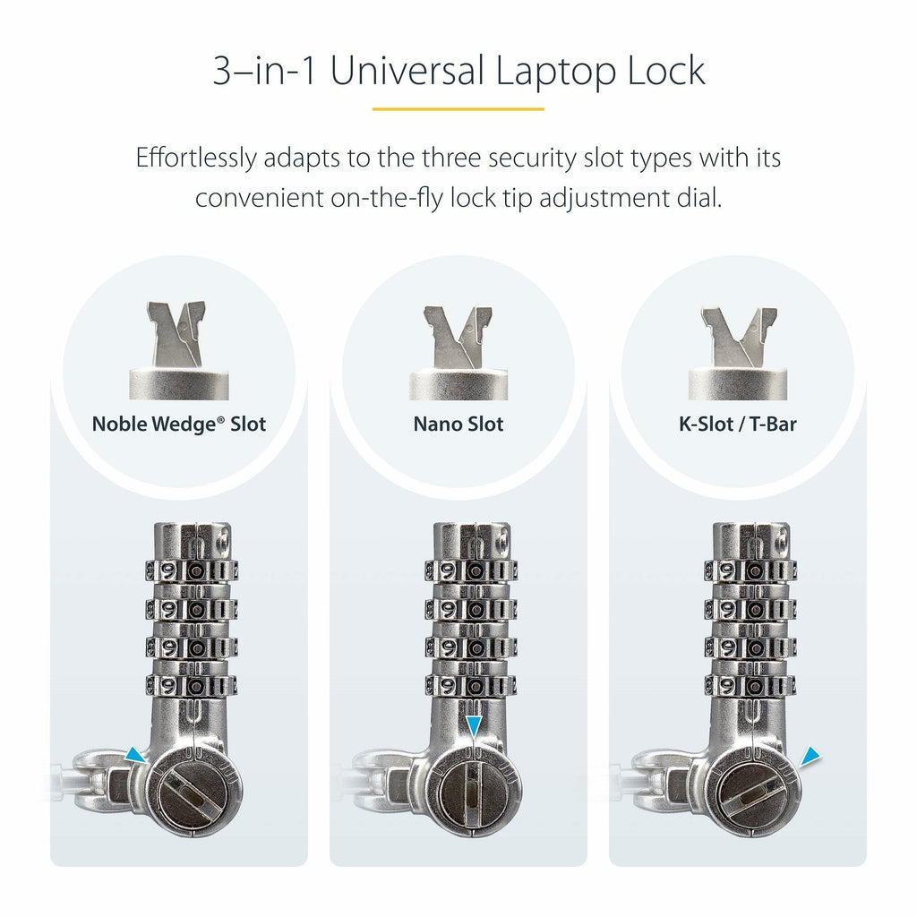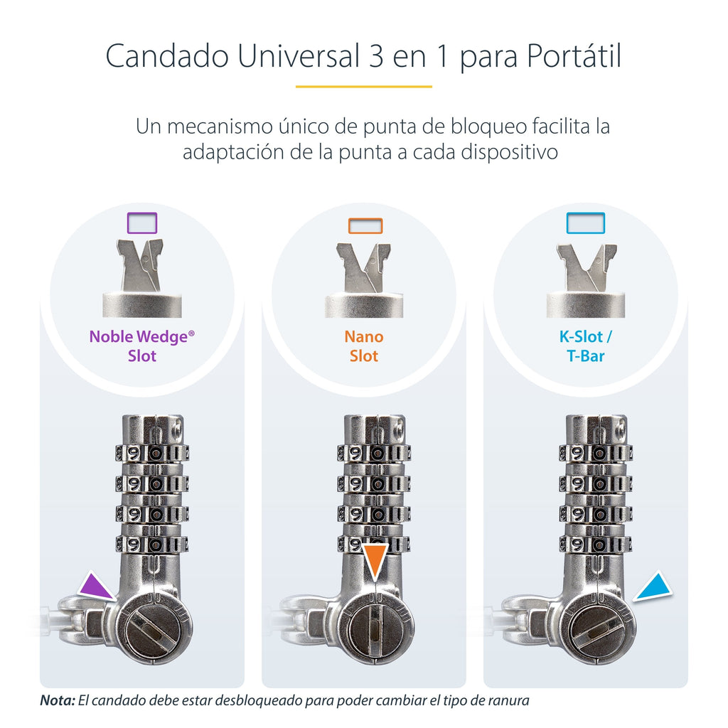 - PAQUETE DE 25 CANDADOS UNIVERSALES 3 EN 1 PARA PORTÁTILES: Compatible con las ranuras de bloqueo Noble Wedge®; K-Slot (T-Bar) y Nano - Cable de 2m y 4,4mm de grosor resistente a los cortes - Soporta una fuerza de tracción de hasta 98kg