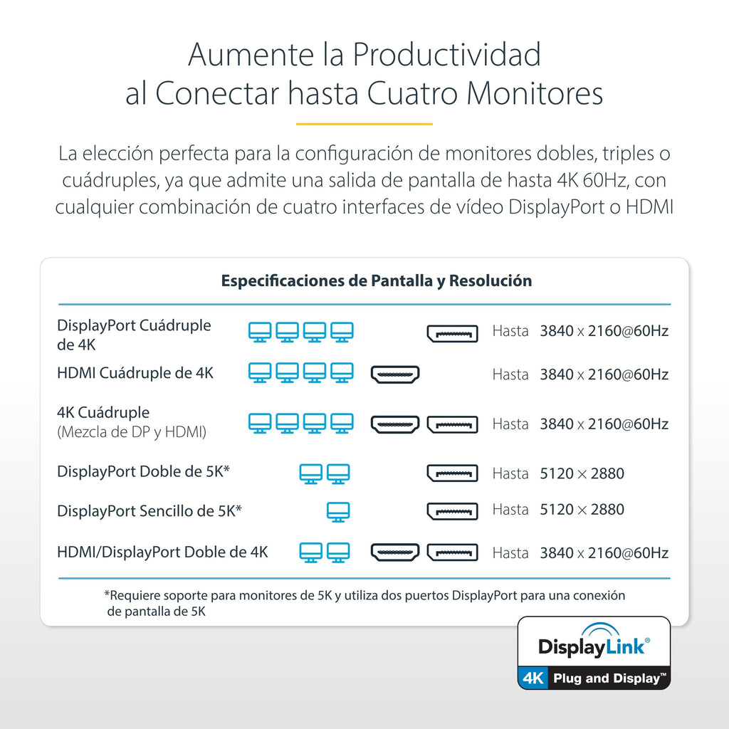 - DOCK USB-C PARA CUATRO MONITORES: Admite hasta cuatro monitores (4K 60Hz), incluyendo pantallas cuádruples, triples o duales en modo ampliado, utilizando cualquier combo de 4 salidas DisplayPort (DP) y/o 4x HDMI 2.0 o Doble de 5K 60Hz, PD 100W